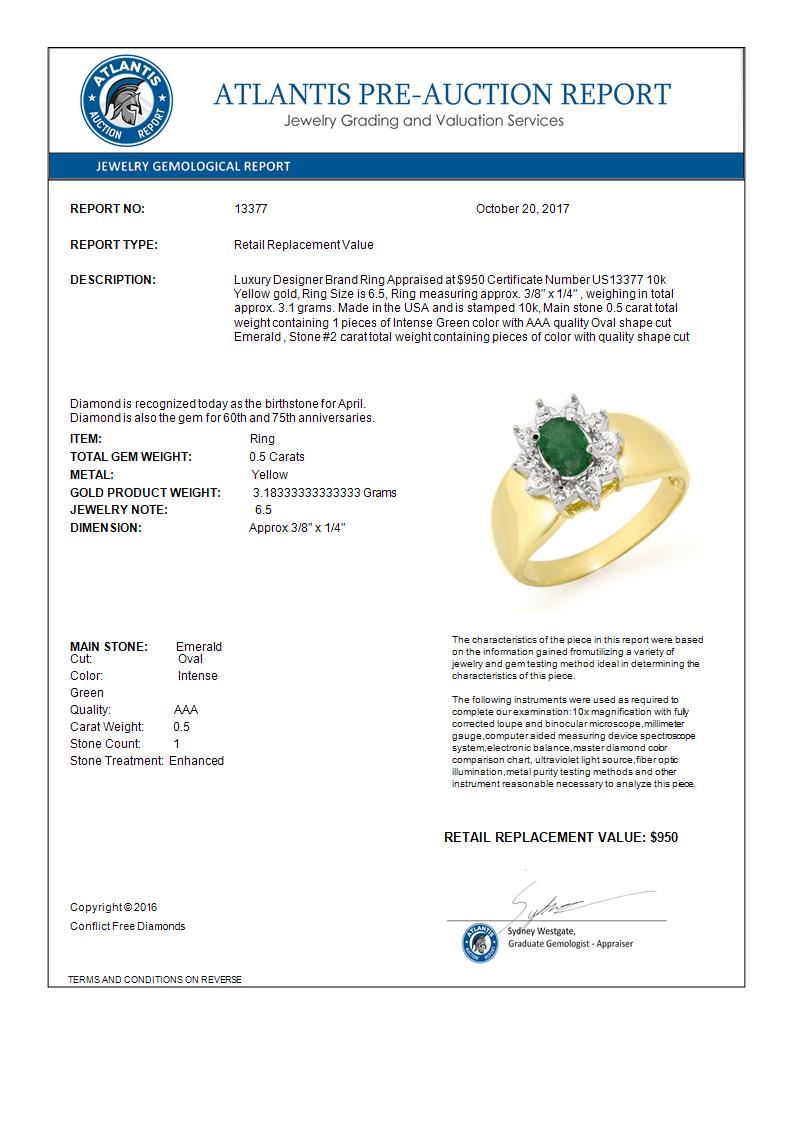 REF-14X5T -13377 ---- 0.50 CTW Emerald Ring 10K Yellow Gold ---- Luxury Designer Brand Ring Appraised at $950 Certificate Number US13377 10k Yellow gold, Ring Size is 6.5, Ring measuring approx. 3/8" x 1/4" , weighing in total approx. 3.1 grams. Made in the USA and is stamped 10k, Main stone 0.5 carat total weight containing 1 pieces of Intense Green color with AAA quality Oval shape cut Emerald , Stone #2 carat total weight containing pieces of color with quality shape cut