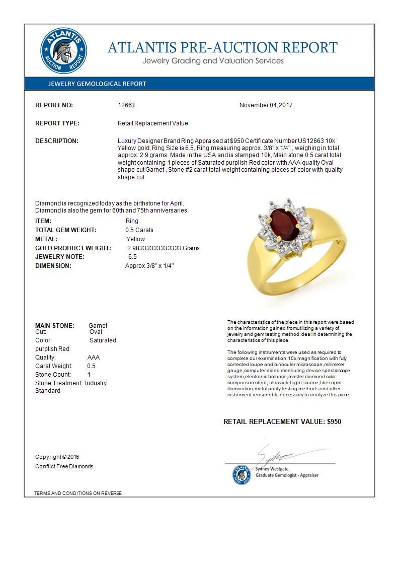 REF-15A6X -12663 ---- 0.50 CTW Garnet Ring 10K Yellow Gold ---- Luxury Designer Brand Ring Appraised at $950 Certificate Number US12663 10k Yellow gold, Ring Size is 6.5, Ring measuring approx. 3/8" x 1/4" , weighing in total approx. 2.9 grams. Made in the USA and is stamped 10k, Main stone 0.5 carat total weight containing 1 pieces of Saturated purplish Red color with AAA quality Oval shape cut Garnet , Stone #2 carat total weight containing pieces of color with quality shape cut