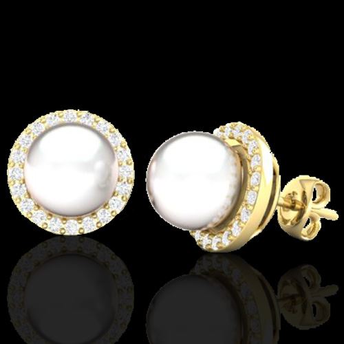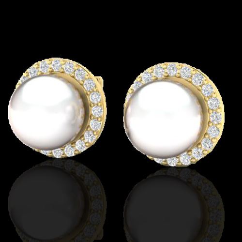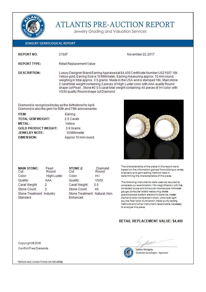 REF-61X5T -21507 ---- 0.50 CTW Micro Pave Halo VS/SI Diamond & Pearl Earrings 18K Yellow Gold ---- Luxury Designer Brand Earring Appraised at $4,400 Certificate Number US21507 18k Yellow gold, Earring Size is 10 Millimeter, Earring measuring approx. 10 mm round, weighing in total approx. 3.5 grams. Made in the USA and is stamped 18k, Main stone 2 carat total weight containing 2 pieces of High Luster color with AAA quality Round shape cut Pearl , Stone #2 0.5 carat total weight containing 40 pieces of H-I color with VS/SI quality Round shape cut Diamond