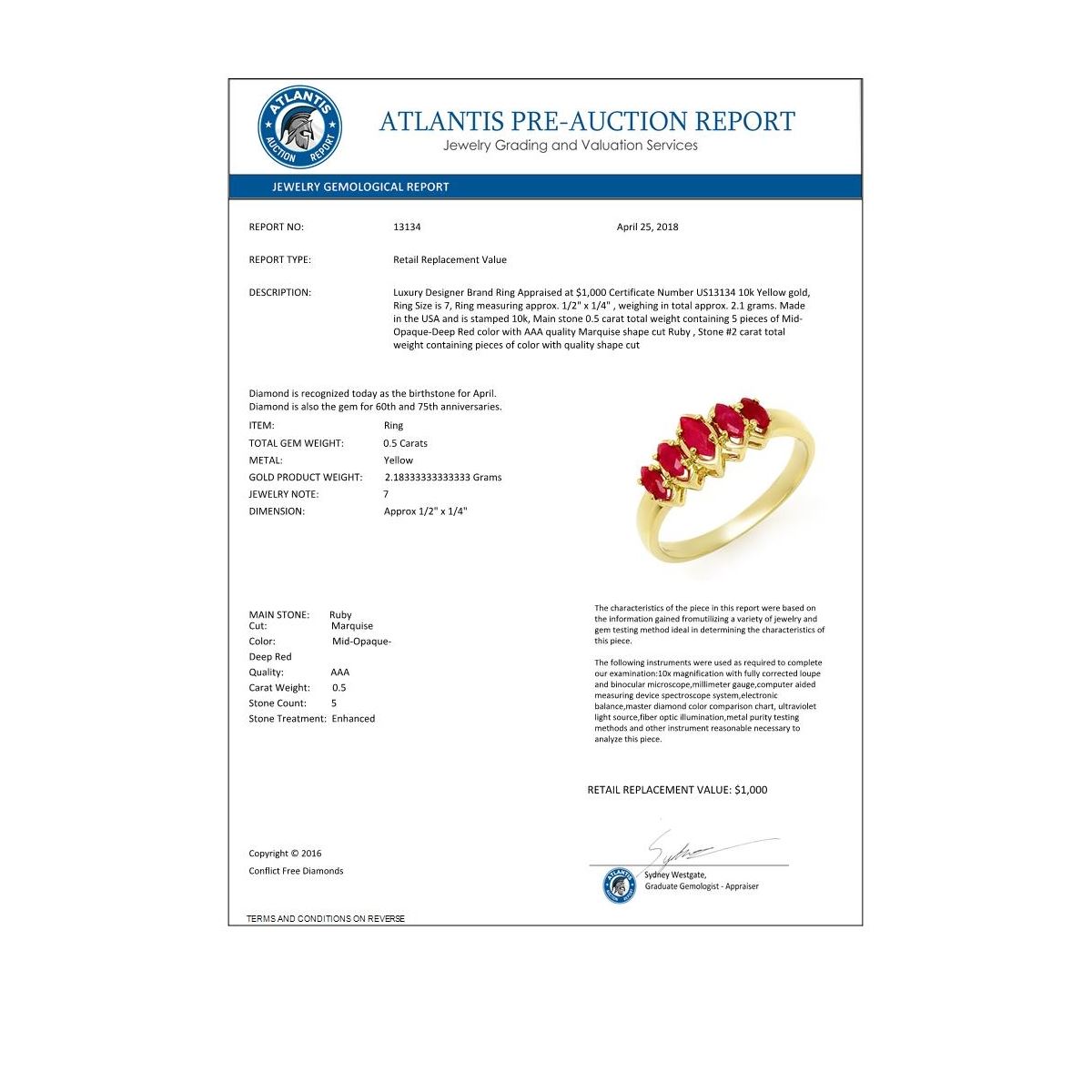REF-15Y5K -13134 ---- 0.50 CTW Ruby Ring 10K Yellow Gold ---- Luxury Designer Brand Ring Appraised at $1,000 Certificate Number US13134 10k Yellow gold, Ring Size is 7, Ring measuring approx. 1/2" x 1/4" , weighing in total approx. 2.1 grams. Made in the USA and is stamped 10k, Main stone 0.5 carat total weight containing 5 pieces of Mid-Opaque-Deep Red color with AAA quality Marquise shape cut Ruby , Stone #2 carat total weight containing pieces of color with quality shape cut