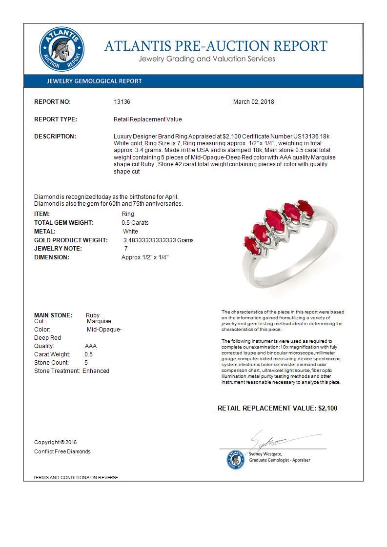 REF-31M6H -13136 ---- 0.50 CTW Ruby Ring 18K White Gold ---- Luxury Designer Brand Ring Appraised at $2,100 Certificate Number US13136 18k White gold, Ring Size is 7, Ring measuring approx. 1/2" x 1/4" , weighing in total approx. 3.4 grams. Made in the USA and is stamped 18k, Main stone 0.5 carat total weight containing 5 pieces of Mid-Opaque-Deep Red color with AAA quality Marquise shape cut Ruby , Stone #2 carat total weight containing pieces of color with quality shape cut