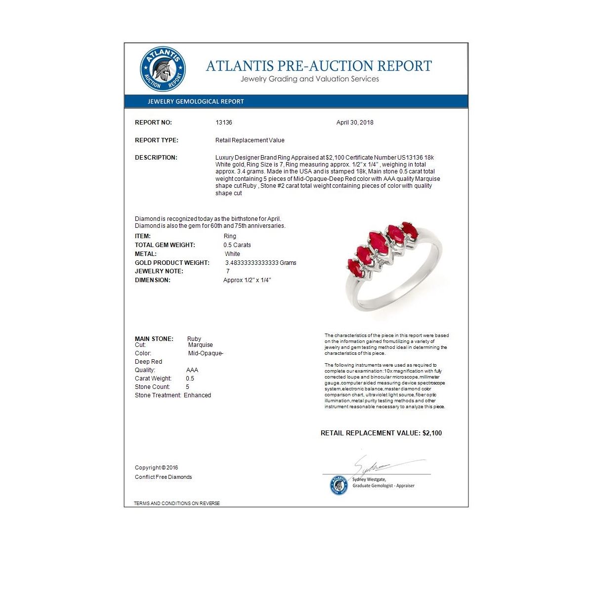 REF-31M6H -13136 ---- 0.50 CTW Ruby Ring 18K White Gold ---- Luxury Designer Brand Ring Appraised at $2,100 Certificate Number US13136 18k White gold, Ring Size is 7, Ring measuring approx. 1/2" x 1/4" , weighing in total approx. 3.4 grams. Made in the USA and is stamped 18k, Main stone 0.5 carat total weight containing 5 pieces of Mid-Opaque-Deep Red color with AAA quality Marquise shape cut Ruby , Stone #2 carat total weight containing pieces of color with quality shape cut