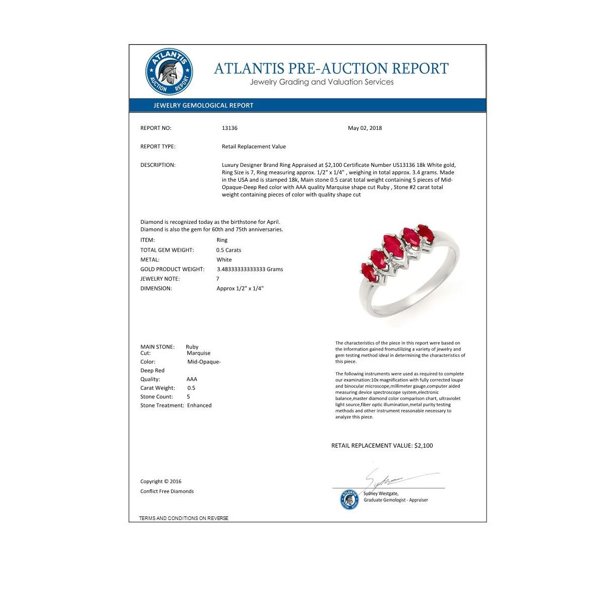 REF-31M6H -13136 ---- 0.50 CTW Ruby Ring 18K White Gold ---- Luxury Designer Brand Ring Appraised at $2,100 Certificate Number US13136 18k White gold, Ring Size is 7, Ring measuring approx. 1/2" x 1/4" , weighing in total approx. 3.4 grams. Made in the USA and is stamped 18k, Main stone 0.5 carat total weight containing 5 pieces of Mid-Opaque-Deep Red color with AAA quality Marquise shape cut Ruby , Stone #2 carat total weight containing pieces of color with quality shape cut