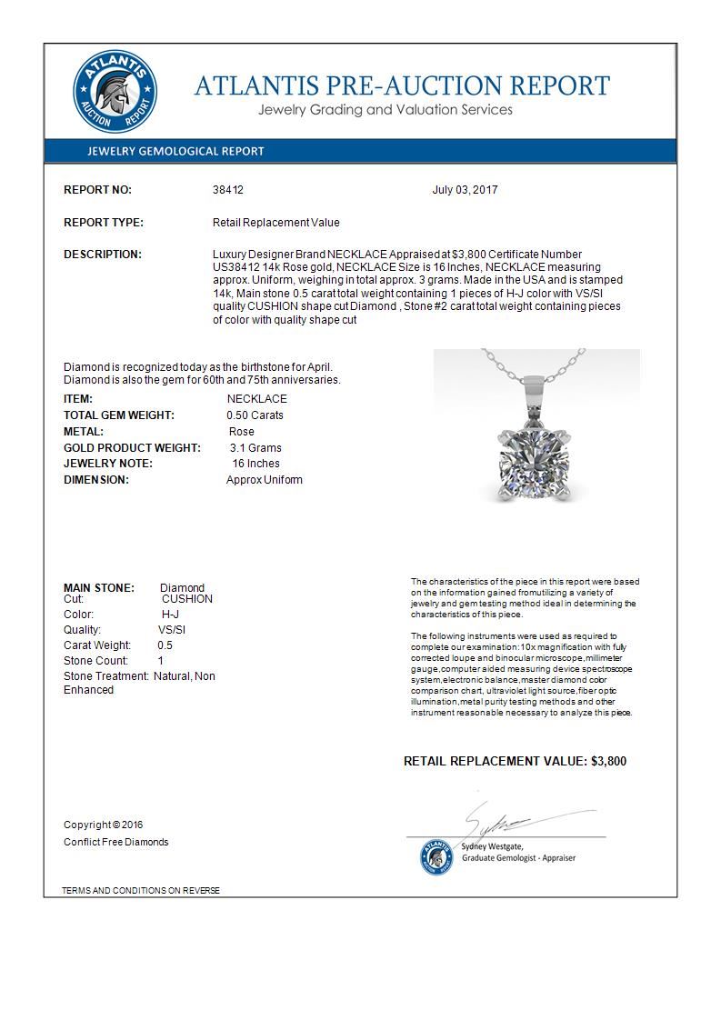 0.50 CTW VS/SI Cushion Diamond Designer Necklace 14K Rose Gold ---- Luxury Designer Brand NECKLACE Appraised Retail Price at $3,800 ---- SKU Number US38412 14k Rose gold NECKLACE Size is 16 Inches, NECKLACE measuring approx. Uniform, weighing in total approx. 3 grams. Made in the USA and is stamped 14k, Main stone 0.5 carat total weight containing 1 pieces of H-J color with VS/SI quality CUSHION shape cut Diamond , Stone #2 carat total weight containing pieces of color with quality shape cut