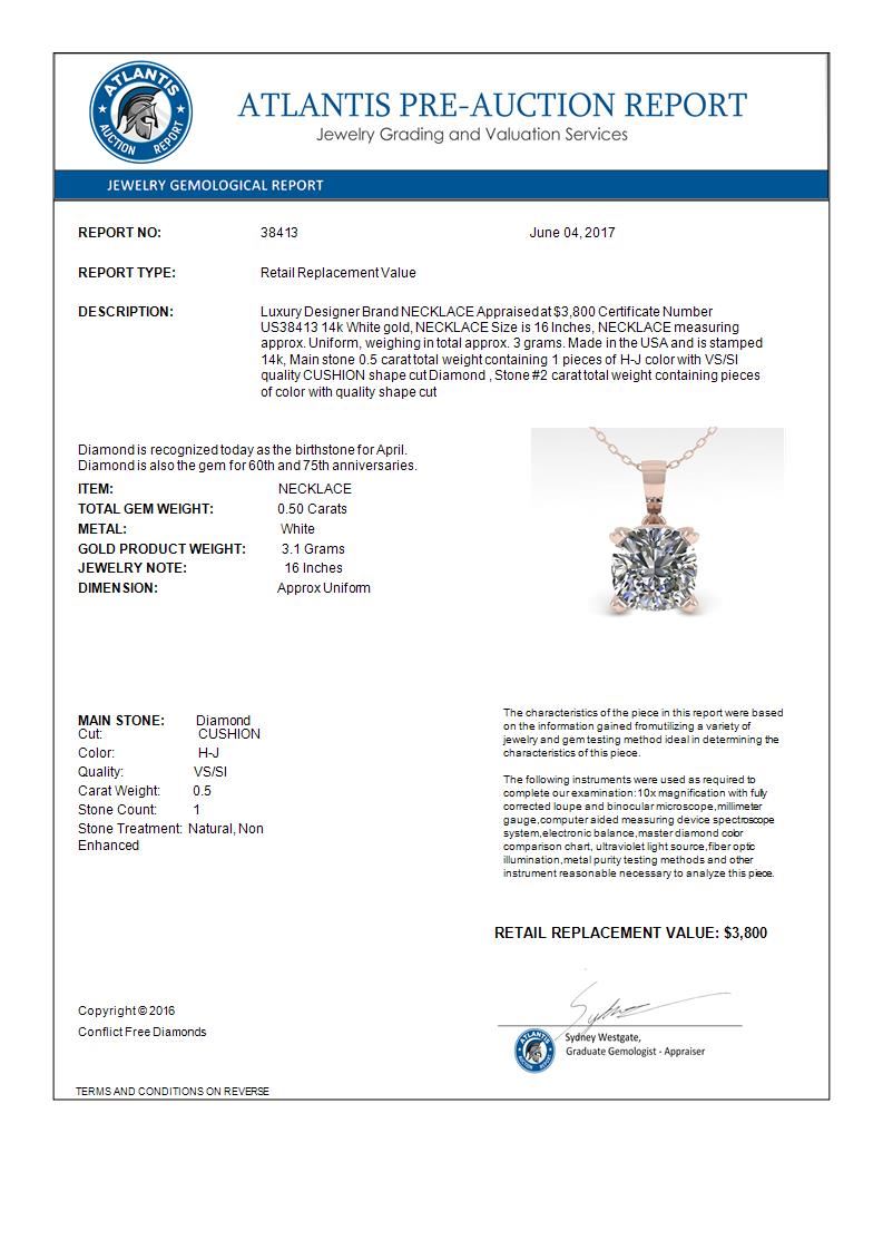 0.50 CTW VS/SI Cushion Diamond Designer Necklace 14K White Gold ---- Luxury Designer Brand NECKLACE Appraised Retail Price at $3,800 ---- SKU Number US38413 14k White gold NECKLACE Size is 16 Inches, NECKLACE measuring approx. Uniform, weighing in total approx. 3 grams. Made in the USA and is stamped 14k, Main stone 0.5 carat total weight containing 1 pieces of H-J color with VS/SI quality CUSHION shape cut Diamond , Stone #2 carat total weight containing pieces of color with quality shape cut