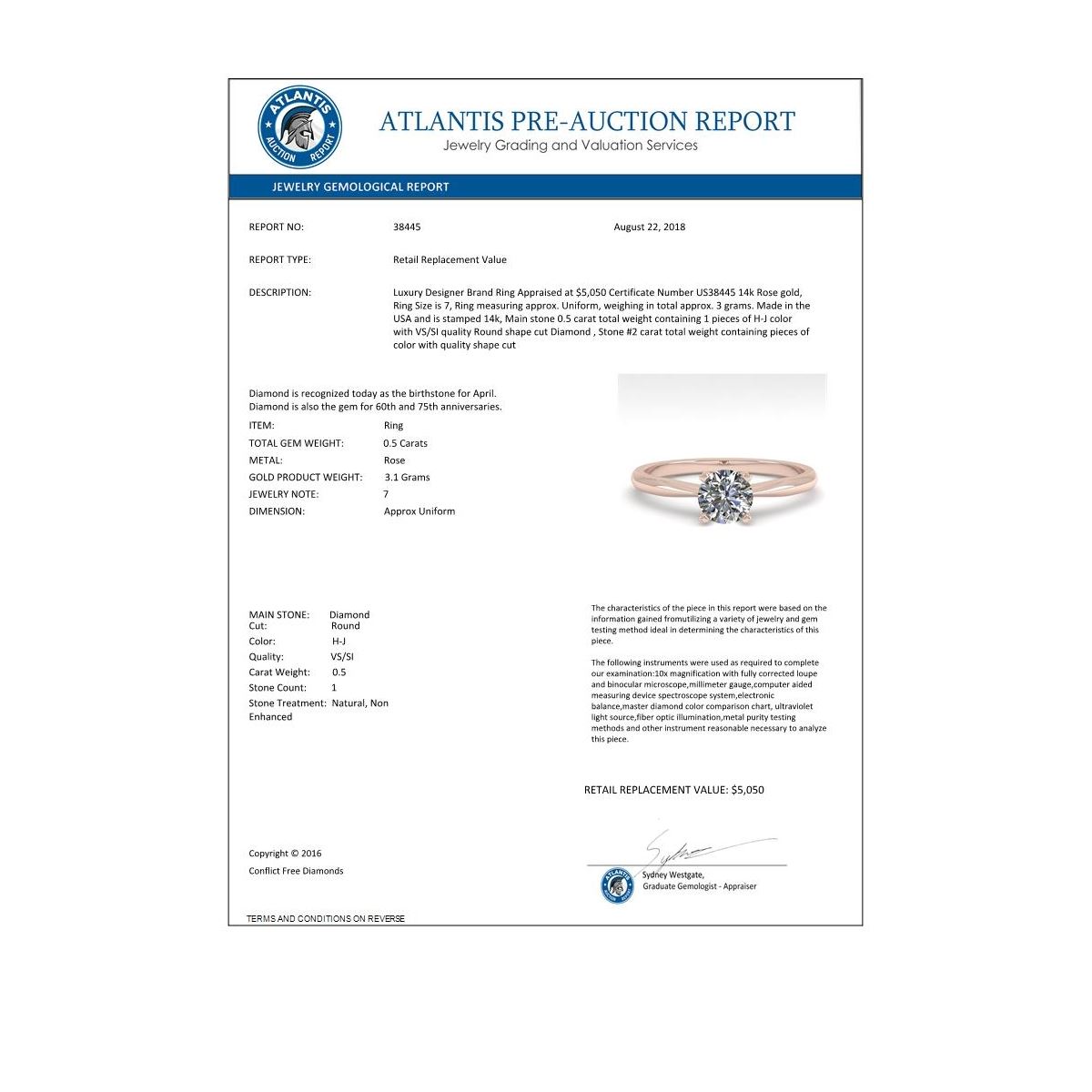 REF-101N8Y -38445 ---- 0.50 CTW VS/SI Diamond Engagement Designer Ring 14K Rose Gold ---- Luxury Designer Brand Ring Appraised at $5,050 Certificate Number US38445 14k Rose gold, Ring Size is 7, Ring measuring approx. Uniform, weighing in total approx. 3 grams. Made in the USA and is stamped 14k, Main stone 0.5 carat total weight containing 1 pieces of H-J color with VS/SI quality Round shape cut Diamond , Stone #2 carat total weight containing pieces of color with quality shape cut