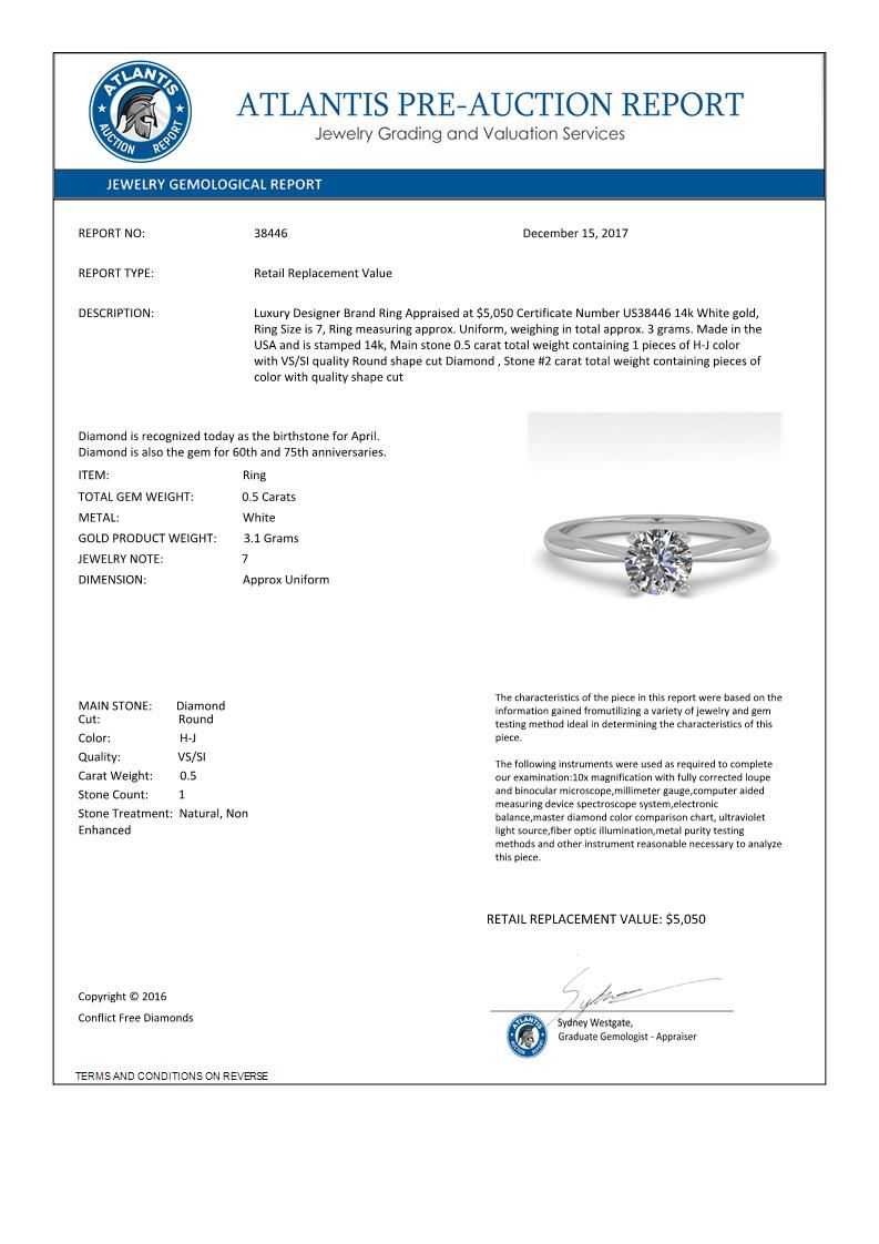 REF-101W8F -38446 ---- 0.50 CTW VS/SI Diamond Engagement Designer Ring 14K White Gold ---- Luxury Designer Brand Ring Appraised at $5,050 Certificate Number US38446 14k White gold, Ring Size is 7, Ring measuring approx. Uniform, weighing in total approx. 3 grams. Made in the USA and is stamped 14k, Main stone 0.5 carat total weight containing 1 pieces of H-J color with VS/SI quality Round shape cut Diamond , Stone #2 carat total weight containing pieces of color with quality shape cut