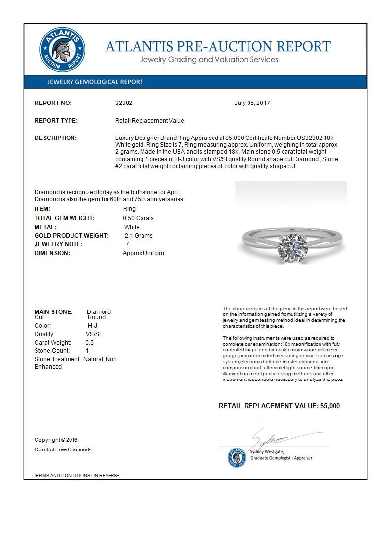 0.50 CTW VS/SI Diamond Engagement Designer Ring 18K White Gold ---- Luxury Designer Brand Ring Appraised Retail Price at $5,000 ---- SKU Number US32382 18k White gold Ring Size is 7, Ring measuring approx. Uniform, weighing in total approx. 2 grams. Made in the USA and is stamped 18k, Main stone 0.5 carat total weight containing 1 pieces of H-J color with VS/SI quality Round shape cut Diamond , Stone #2 carat total weight containing pieces of color with quality shape cut