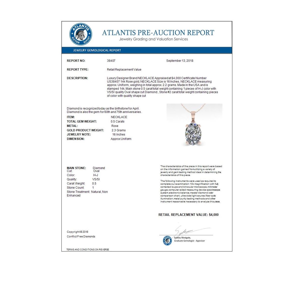 REF-81N3Y -38407 ---- 0.50 CTW VS/SI Oval Diamond Designer Necklace 14K Rose Gold ---- Luxury Designer Brand NECKLACE Appraised at $4,000 Certificate Number US38407 14k Rose gold, NECKLACE Size is 16 Inches, NECKLACE measuring approx. Uniform, weighing in total approx. 2.2 grams. Made in the USA and is stamped 14k, Main stone 0.5 carat total weight containing 1 pieces of H-J color with VS/SI quality Oval shape cut Diamond , Stone #2 carat total weight containing pieces of color with quality shape cut