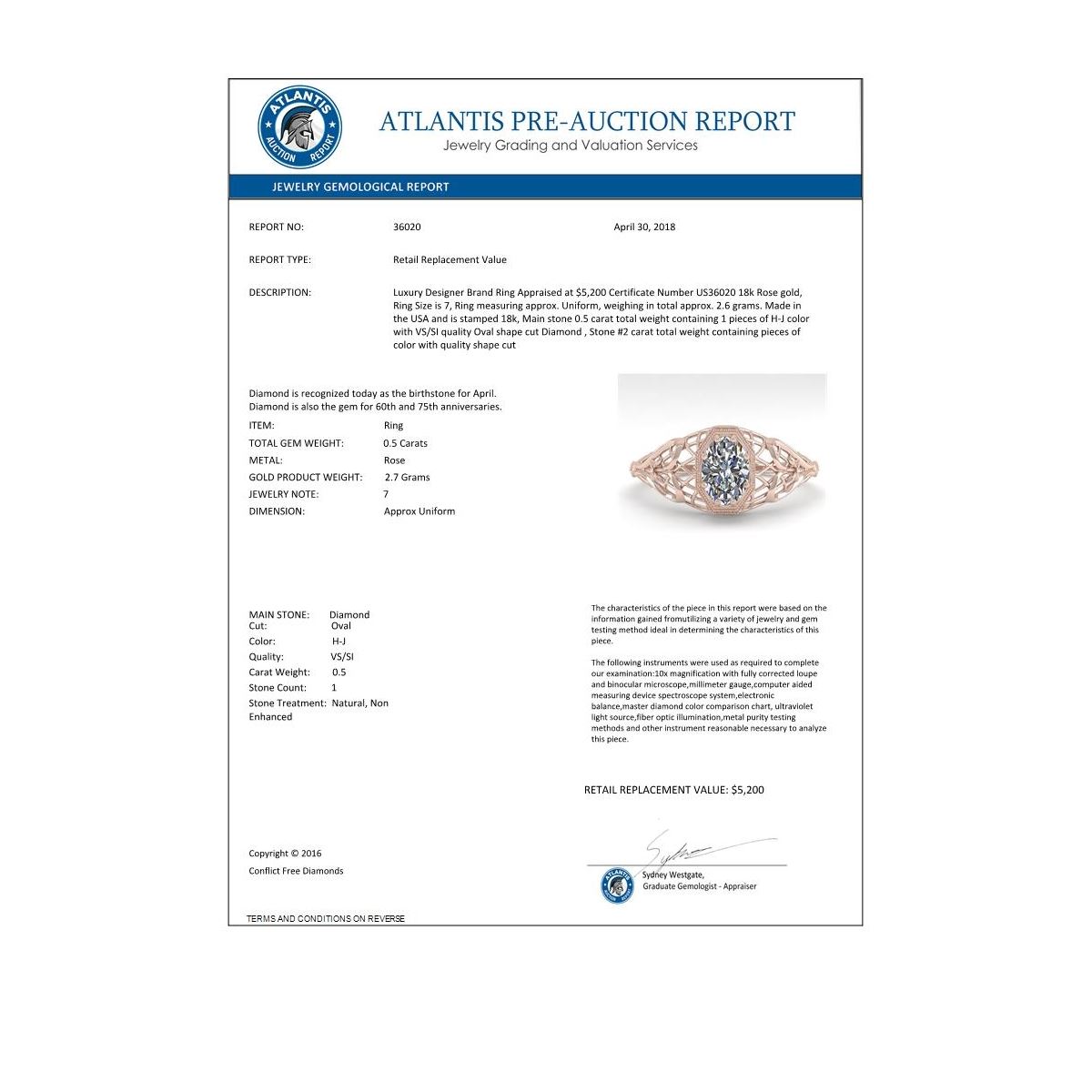 REF-104T8M -36020 ---- 0.50 CTW VS/SI Oval Diamond Solitaire Engagement Ring Deco Size 7 18K Rose Gold ---- Luxury Designer Brand Ring Appraised at $5,200 Certificate Number US36020 18k Rose gold, Ring Size is 7, Ring measuring approx. Uniform, weighing in total approx. 2.6 grams. Made in the USA and is stamped 18k, Main stone 0.5 carat total weight containing 1 pieces of H-J color with VS/SI quality Oval shape cut Diamond , Stone #2 carat total weight containing pieces of color with quality shape cut