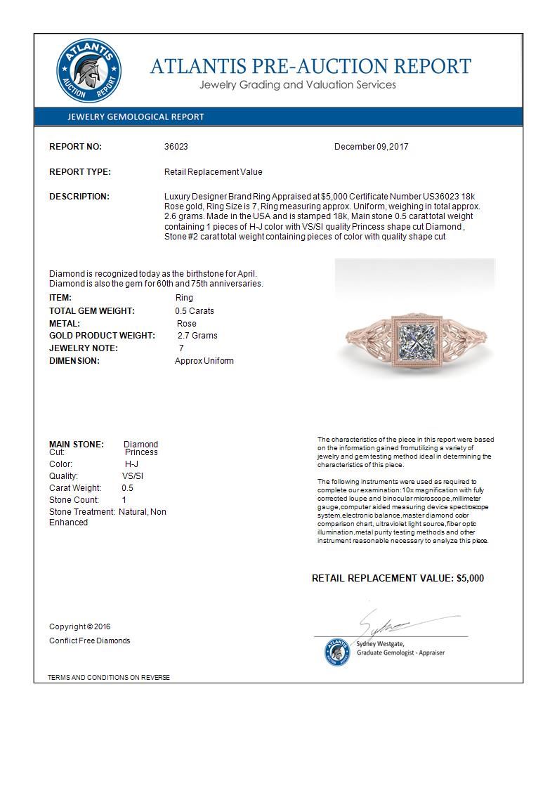 REF-113W8F -36023 ---- 0.50 CTW VS/SI Princess Diamond Solitaire Engagement Ring Deco 18K Rose Gold ---- Luxury Designer Brand Ring Appraised at $5,000 Certificate Number US36023 18k Rose gold, Ring Size is 7, Ring measuring approx. Uniform, weighing in total approx. 2.6 grams. Made in the USA and is stamped 18k, Main stone 0.5 carat total weight containing 1 pieces of H-J color with VS/SI quality Princess shape cut Diamond , Stone #2 carat total weight containing pieces of color with quality shape cut
