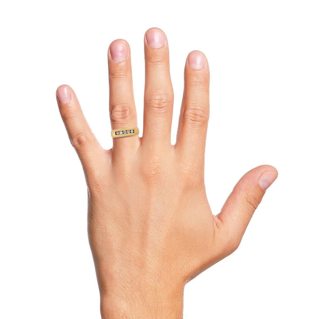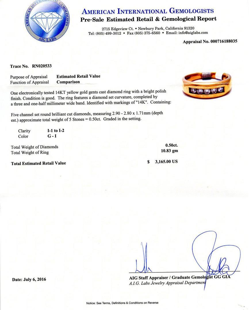 0.50ctw Diamond 14K Yellow Gold Ring. One electronically tested 14KT yellow gold gents cast diamond ring with a bright polish finish. Condition is good. The ring features a diamond set curvature, completed by a three and one-half millimeter wide band. Identified with markings of "14K". Containing: Five channel set round brilliant cut diamonds, measuring 2.90 - 2.80 x 1.71 mm (depth est.) approximate total weight of 5 Stones = 0.50ct. Graded in the setting. Clarity I-1 to I-2 Color G-I Total Weight of Diamonds 0.50ct. Total Weight of Ring 10.83 gm