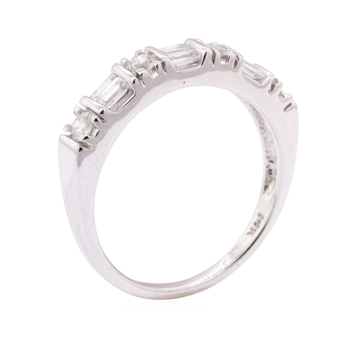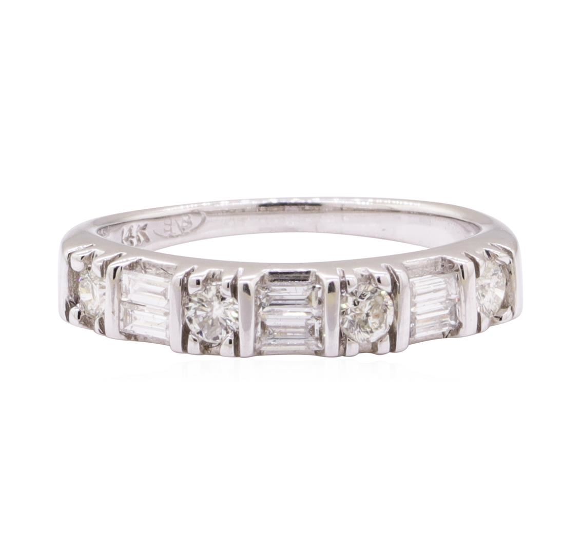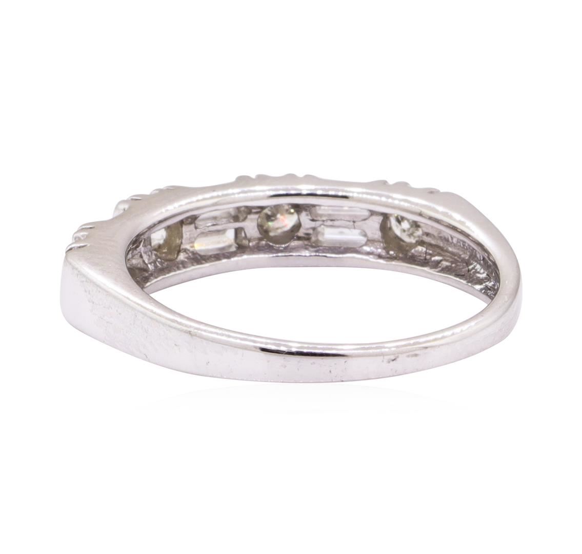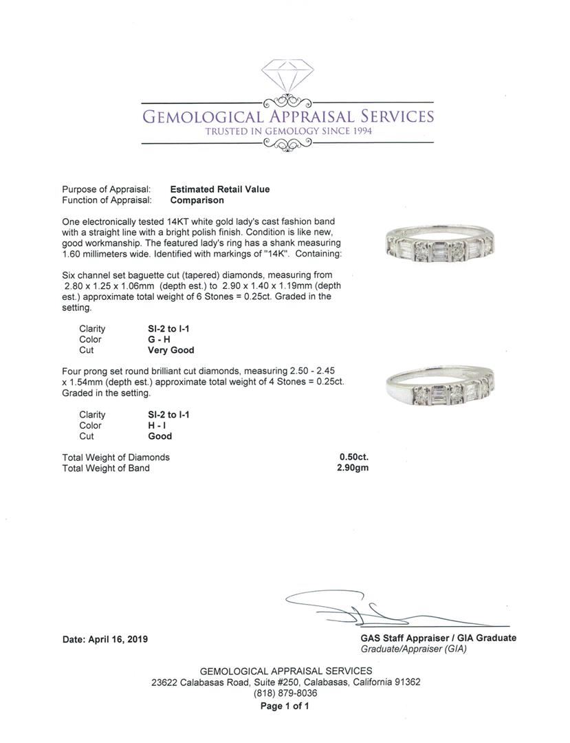 One electronically tested 14KT white gold lady's cast fashion band with a straight line with a bright polish finish. The featured lady's ring has a shank measuring 1.60 millimeters wide. Identified with markings of '14K'. Condition is like new, good workmanship. Containing: Six channel set baguette cut (tapered) diamonds, measuring from 2.80 x 1.25 x 1.06mm (depth est.) to 2.90 x 1.40 x 1.19mm (depth est.) approximate total weight of 6 Stones = 0.25ct. Graded in the setting. Color G - H Clarity SI-2 to I-1 Cut Very Good Four prong set round brilliant cut diamonds, measuring 2.50 - 2.45 x 1.54mm (depth est.) approximate total weight of 4 Stones = 0.25ct. Graded in the setting. Color H - I Clarity SI-2 to I-1 Cut Good. Total Weight of Diamonds 0.50ct.. Total Weight of Band 2.90gm GAS Appraised at $1850.00. GAS Appraised at $9,195.00.