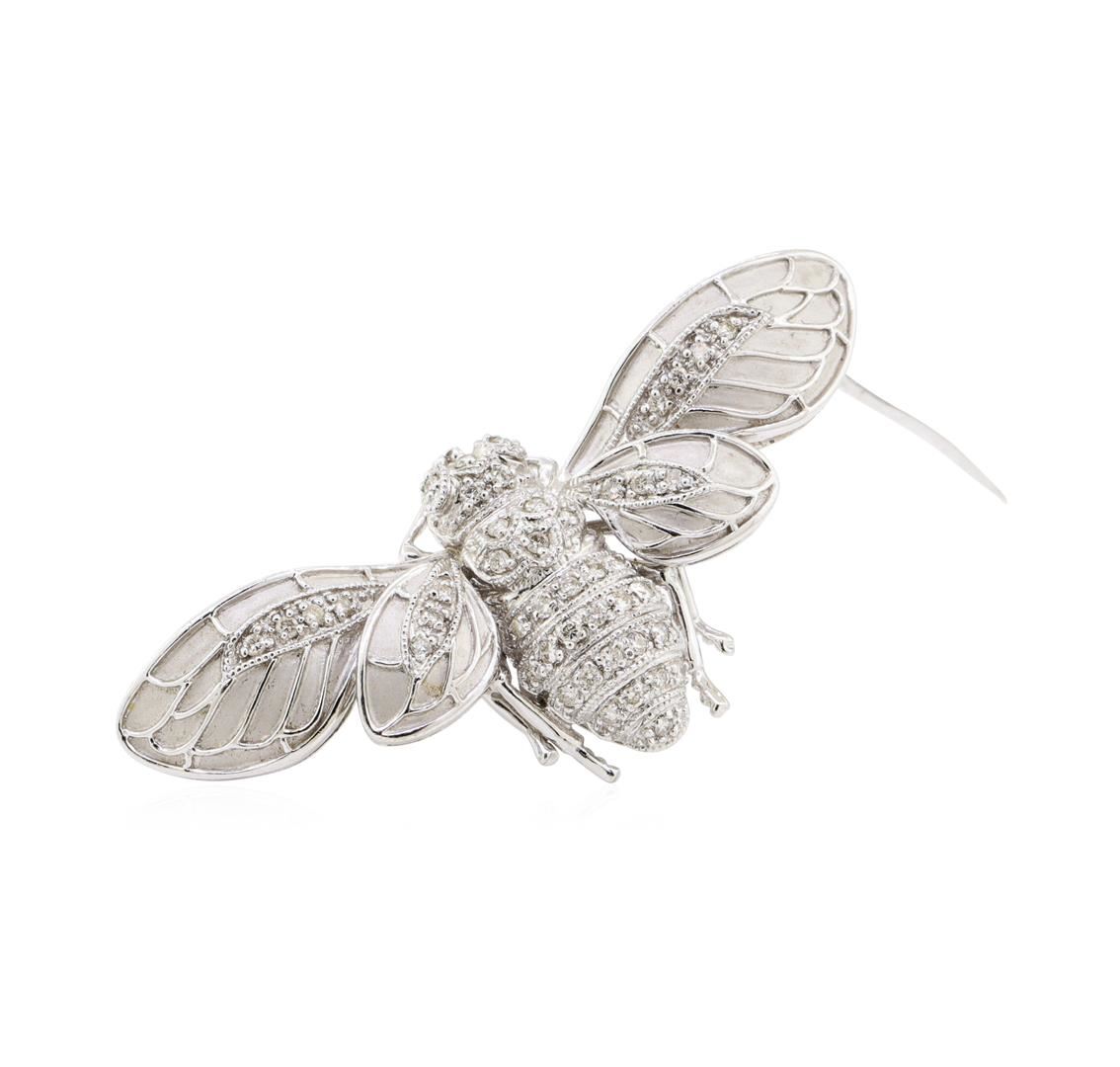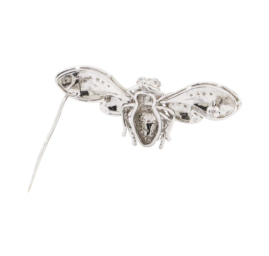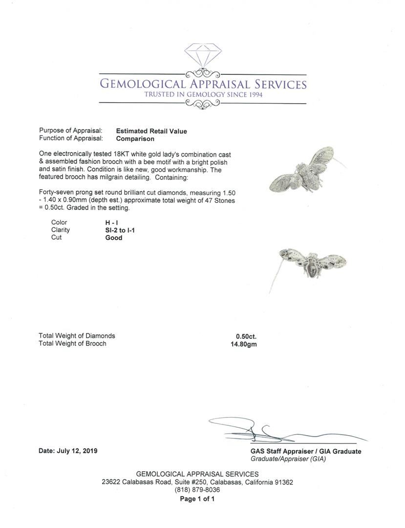 One electronically tested 18KT white gold lady's combination cast & assembled fashion brooch with a bee motif with a bright polish and satin finish. The featured brooch has milgrain detailing. Condition is like new, good workmanship. Containing: Forty-Seven prong set round brilliant cut diamonds, measuring 1.50 - 1.40 x 0.90mm (depth est.) approximate total weight of 47 Stones = 0.50ct. Graded in the setting. Color H - I Clarity SI-2 to I-1 Cut Good. Total Weight of Diamonds 0.50ct.. Total Weight of Brooch 14.80gm GAS Appraised at $3595.00. GAS Appraised at $3,595.00.
