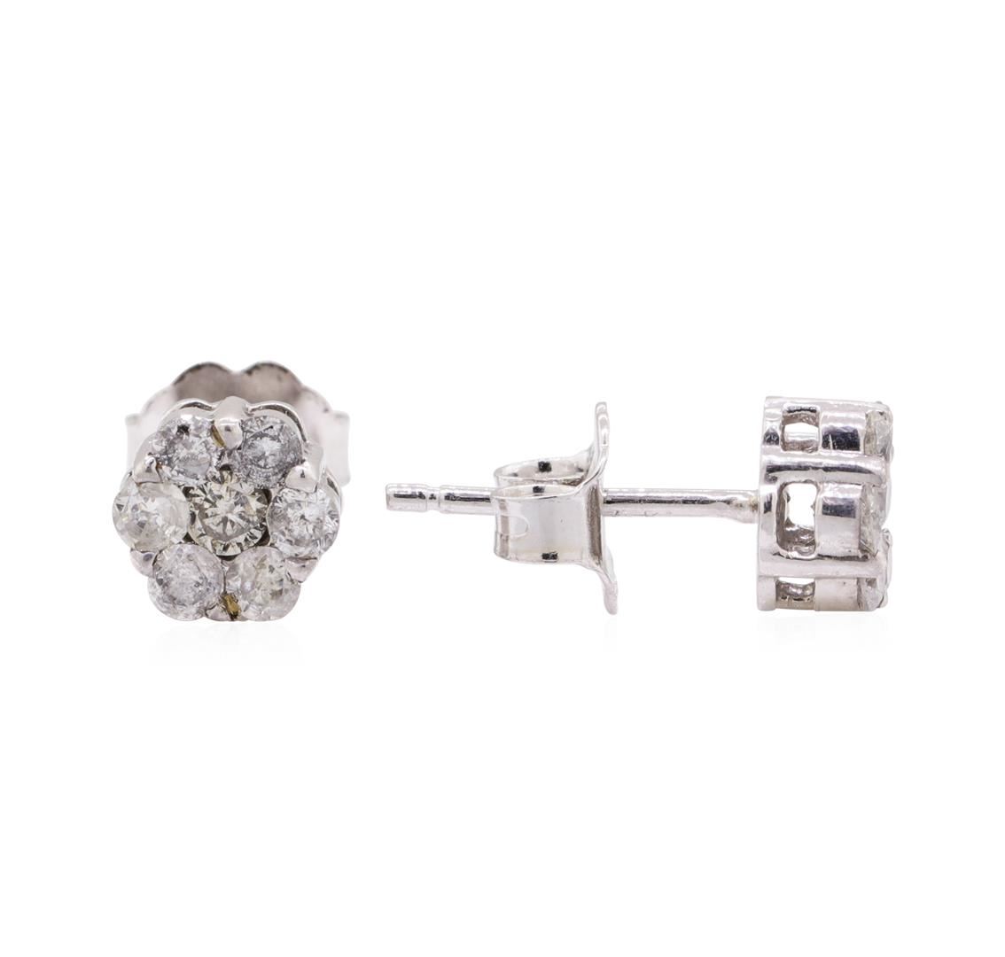 One pair of diamond cluster studs with friction posts and backs featuring: 14KT white gold weighing 1.3 grams containing diamonds weighing 0.50ctw.