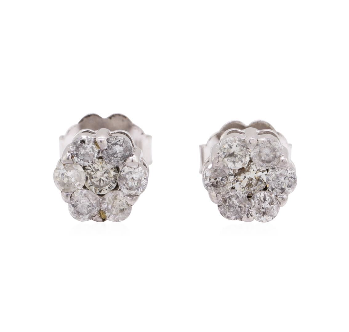 One pair of diamond cluster studs with friction posts and backs featuring: 14KT white gold weighing 1.3 grams containing diamonds weighing 0.50ctw.