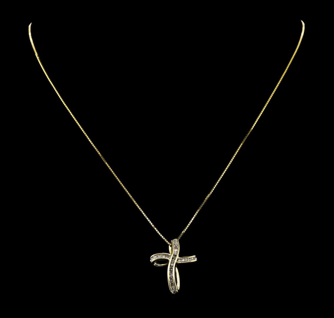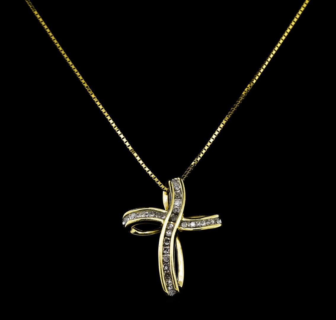 One lady's cross pendant and eighteen inch 1mm box chain featuring: 14KT yellow gold weighing 4.0 grams containing diamonds weighing 0.50ctw.