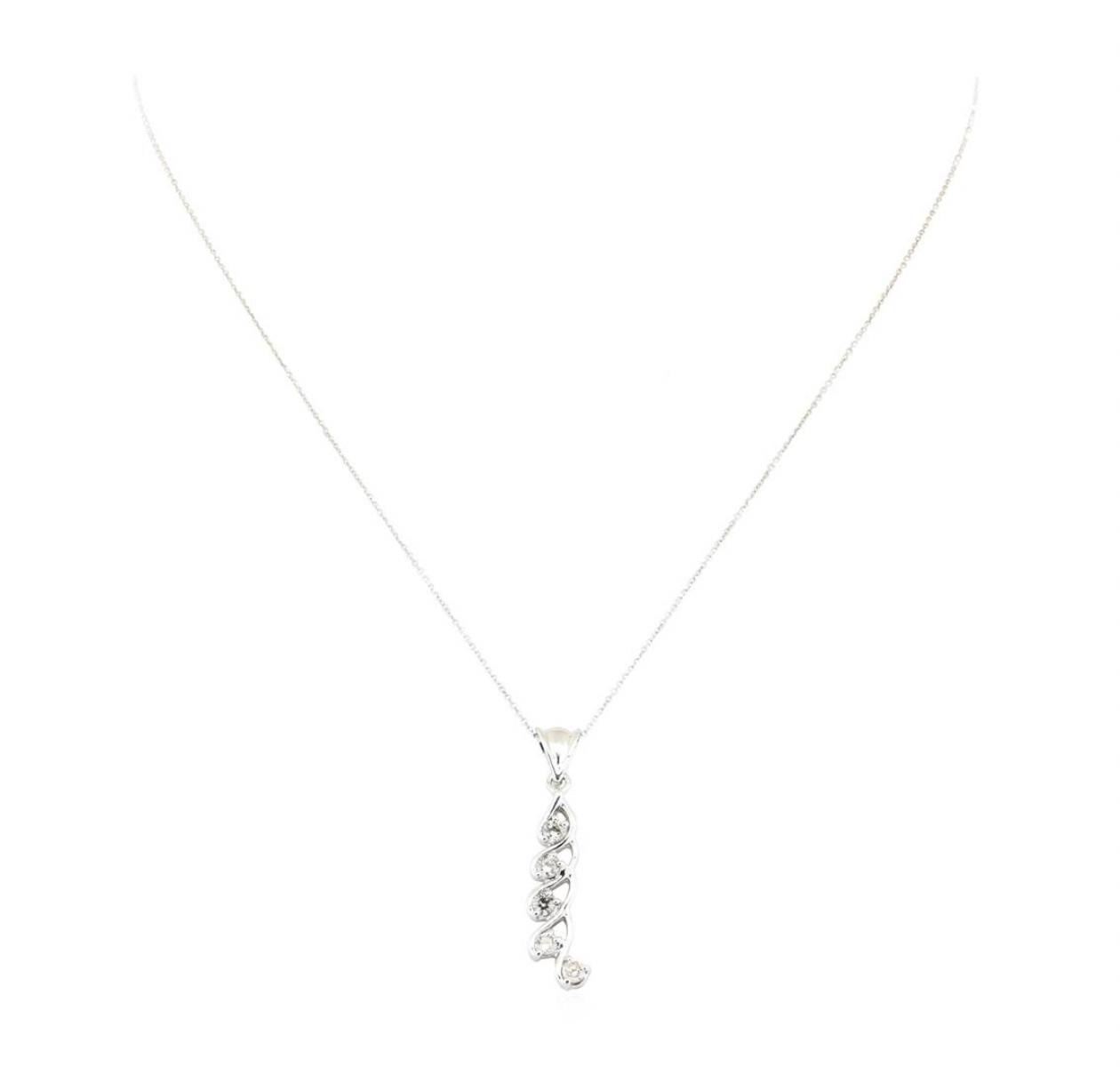 One descending diamond pendant with chain featuring: 14KT white gold weighing 4.0 grams containing diamonds weighing 0.50ctw. The chain is a 1mm diamond cut cable link chain measuring sixteen inches in length.