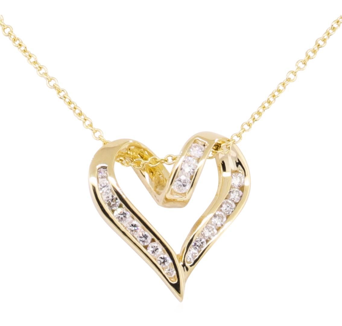 One pendant with chain featuring: 14KT yellow gold weighing 4.0 grams containing diamonds weighing 0.50ctw. The pendant has an attached sixteen inch long 1.2mm rounded cable link chain.