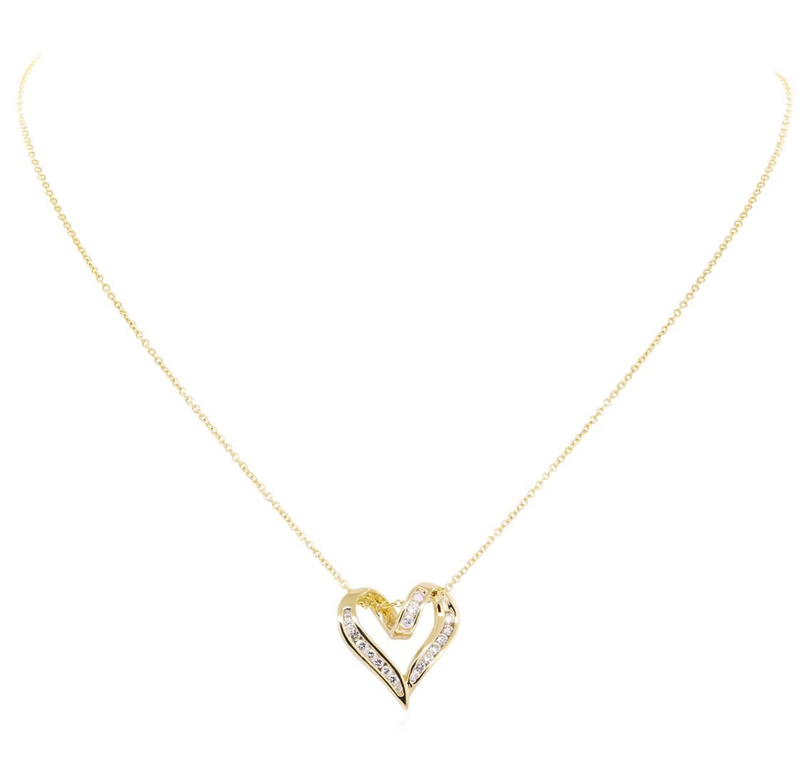 One pendant with chain featuring: 14KT yellow gold weighing 4.0 grams containing diamonds weighing 0.50ctw. The pendant has an attached sixteen inch long 1.2mm rounded cable link chain.