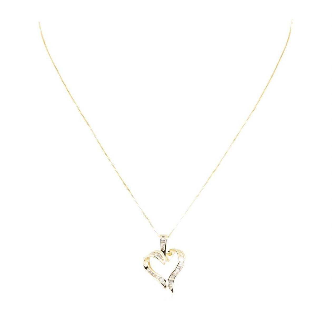 One heart shaped pendant with an attached eighteen inch long box chain featuring: 14KT yellow gold weighing 3.8 grams containing diamonds weighing 0.50ctw.