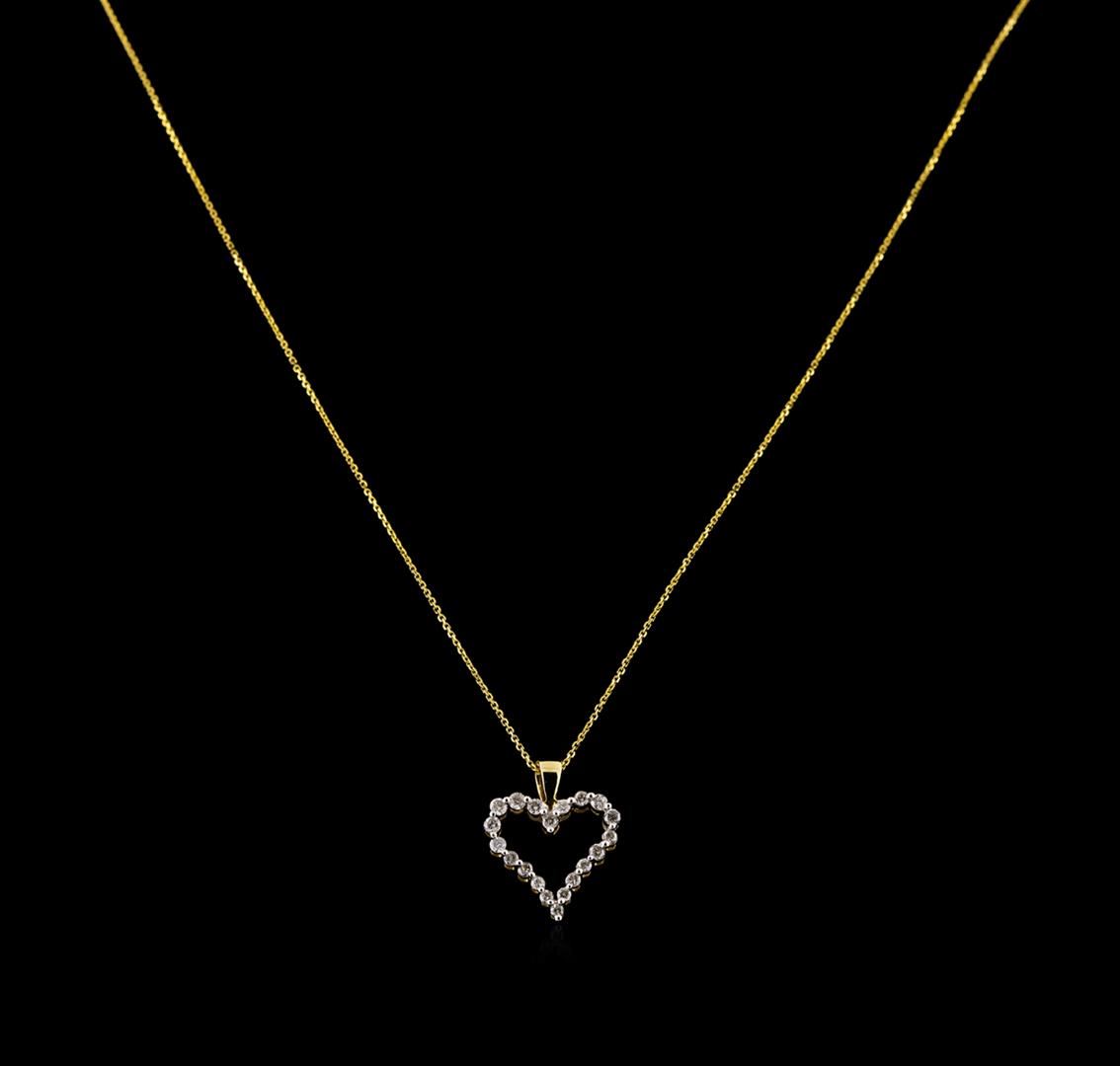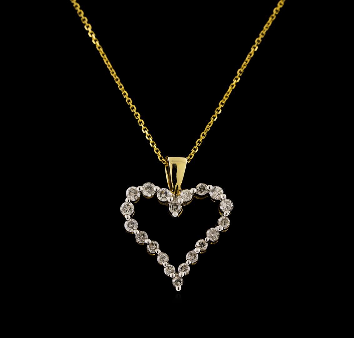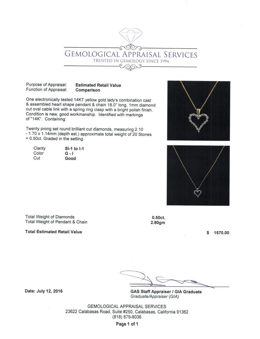 One electronically tested 14KT yellow gold lady's combination cast & assembled heart shape pendant & chain 18.0' long, 1mm diamond cut oval cable link with a spring ring clasp with a bright polish finish. Identified with markings of '14K'. Condition is new, good workmanship. Containing: Twenty prong set round brilliant cut diamonds, measuring 2.10 - 1.70 x 1.14mm (depth est.) approximate total weight of 20 Stones = 0.50ct. Graded in the setting. Clarity SI-1 to I-1. Color: G - I Cut Good. Total Weight of Diamonds 0.50ct.. Total Weight of Pendant & Chain 2.80gm. GAS Appraised at $1,570.00.