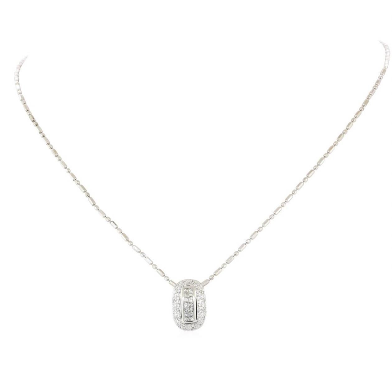 One pendant with an attached 16 inch long, 1mm chain cast in 14KT white gold featuring: 18KT white gold weighing a total of 5.5 grams containing diamonds weighing 0.50ctw.
