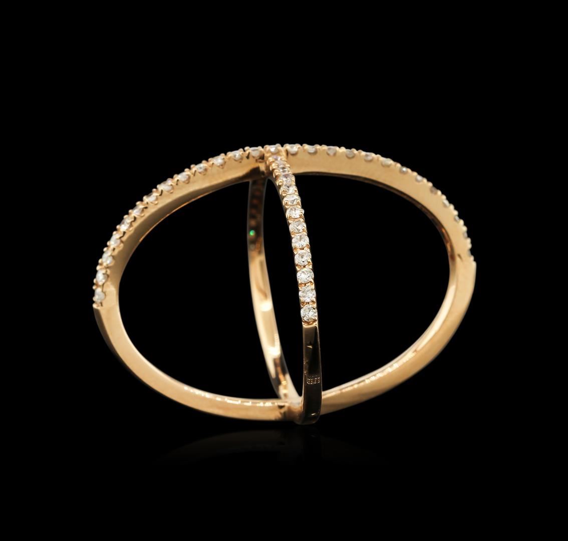 One crossover design ring featuring: 14KT rose gold weighing 3.37 grams containing prong set round diamonds with a total weight of 0.50ct.
