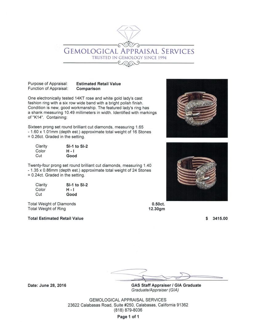 One electronically tested 14KT rose and white gold lady's cast fashion ring with a six row wide band with a bright polish finish. The featured lady's ring has a shank measuring 10.49 millimeters in width. Identified with markings of "K14". Condition is new, good workmanship. Containing: Sixteen prong set round brilliant cut diamonds, measuring 1.65 - 1.60 x 1.01mm (depth est.) approximate total weight of 16 Stones = 0.26ct. Graded in the setting. Clarity: SI-1 to SI-2. Color: H - I. Cut Good Twenty-Four prong set round brilliant cut diamonds, measuring 1.40 - 1.35 x 0.86mm (depth est.) approximate total weight of 24 Stones = 0.24ct. Graded in the setting. Clarity: SI-1 to SI-2. Color: H - I. Cut Good. Total Weight of Diamonds 0.50ct. Total Weight of Ring 12.30gm. GAS Appraised at $3,415.00.
