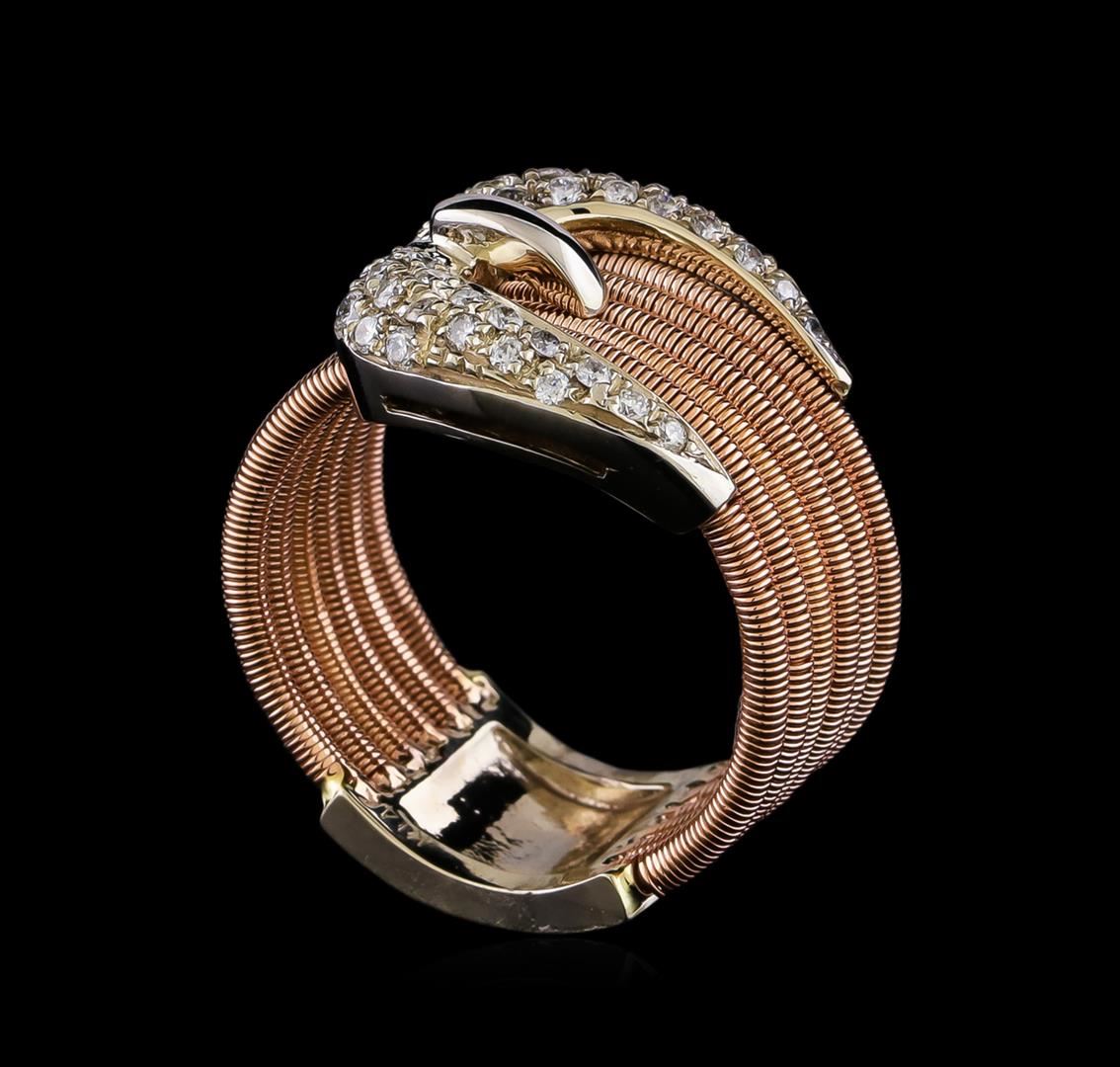 One electronically tested 14KT rose and white gold lady's cast fashion ring with a six row wide band with a bright polish finish. The featured lady's ring has a shank measuring 10.49 millimeters in width. Identified with markings of "K14". Condition is new, good workmanship. Containing: Sixteen prong set round brilliant cut diamonds, measuring 1.65 - 1.60 x 1.01mm (depth est.) approximate total weight of 16 Stones = 0.26ct. Graded in the setting. Clarity: SI-1 to SI-2. Color: H - I. Cut Good Twenty-Four prong set round brilliant cut diamonds, measuring 1.40 - 1.35 x 0.86mm (depth est.) approximate total weight of 24 Stones = 0.24ct. Graded in the setting. Clarity: SI-1 to SI-2. Color: H - I. Cut Good. Total Weight of Diamonds 0.50ct. Total Weight of Ring 12.30gm. GAS Appraised at $3,415.00.
