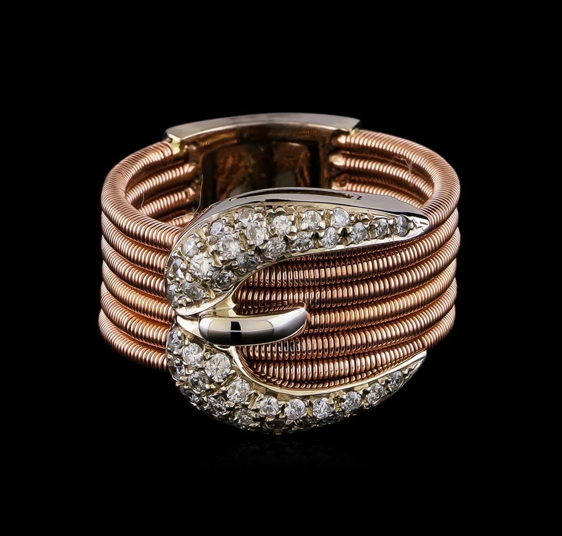 One electronically tested 14KT rose and white gold lady's cast fashion ring with a six row wide band with a bright polish finish. The featured lady's ring has a shank measuring 10.49 millimeters in width. Identified with markings of "K14". Condition is new, good workmanship. Containing: Sixteen prong set round brilliant cut diamonds, measuring 1.65 - 1.60 x 1.01mm (depth est.) approximate total weight of 16 Stones = 0.26ct. Graded in the setting. Clarity: SI-1 to SI-2. Color: H - I. Cut Good Twenty-Four prong set round brilliant cut diamonds, measuring 1.40 - 1.35 x 0.86mm (depth est.) approximate total weight of 24 Stones = 0.24ct. Graded in the setting. Clarity: SI-1 to SI-2. Color: H - I. Cut Good. Total Weight of Diamonds 0.50ct. Total Weight of Ring 12.30gm. GAS Appraised at $3,415.00.
