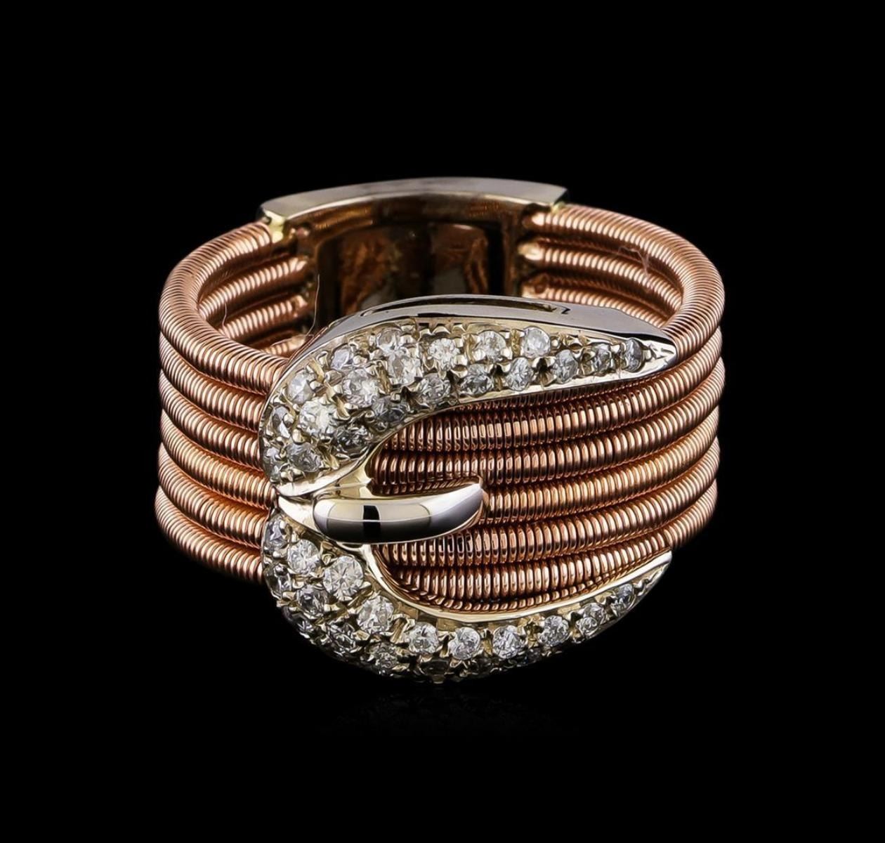 One electronically tested 14KT rose and white gold lady's cast fashion ring with a six row wide band with a bright polish finish. The featured lady's ring has a shank measuring 10.49 millimeters in width. Identified with markings of "K14". Condition is new, good workmanship. Containing: Sixteen prong set round brilliant cut diamonds, measuring 1.65 - 1.60 x 1.01mm (depth est.) approximate total weight of 16 Stones = 0.26ct. Graded in the setting. Clarity: SI-1 to SI-2. Color: H - I. Cut Good Twenty-Four prong set round brilliant cut diamonds, measuring 1.40 - 1.35 x 0.86mm (depth est.) approximate total weight of 24 Stones = 0.24ct. Graded in the setting. Clarity: SI-1 to SI-2. Color: H - I. Cut Good. Total Weight of Diamonds 0.50ct. Total Weight of Ring 12.30gm. GAS Appraised.