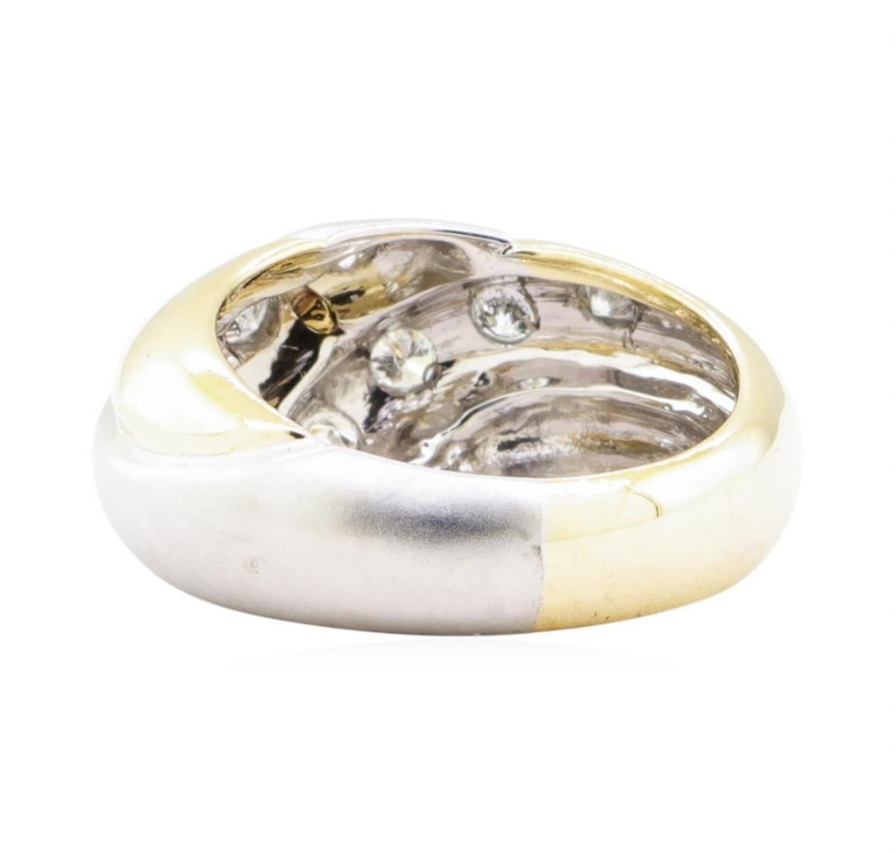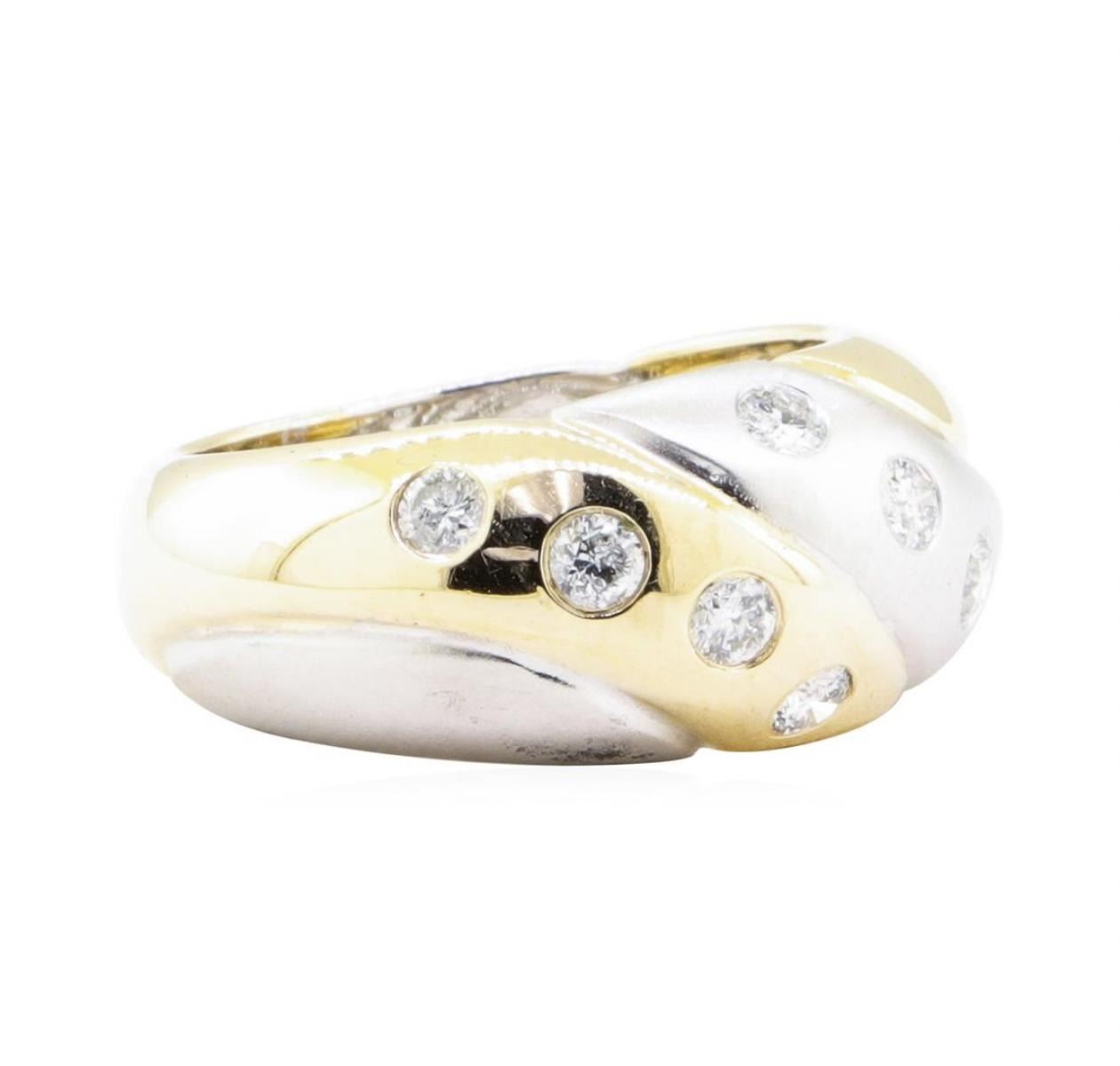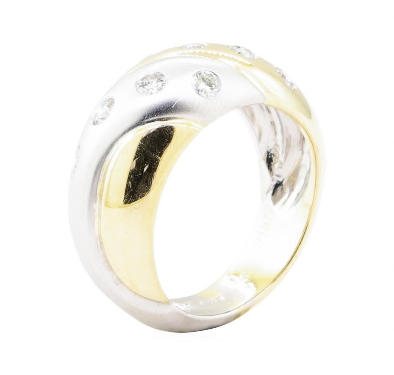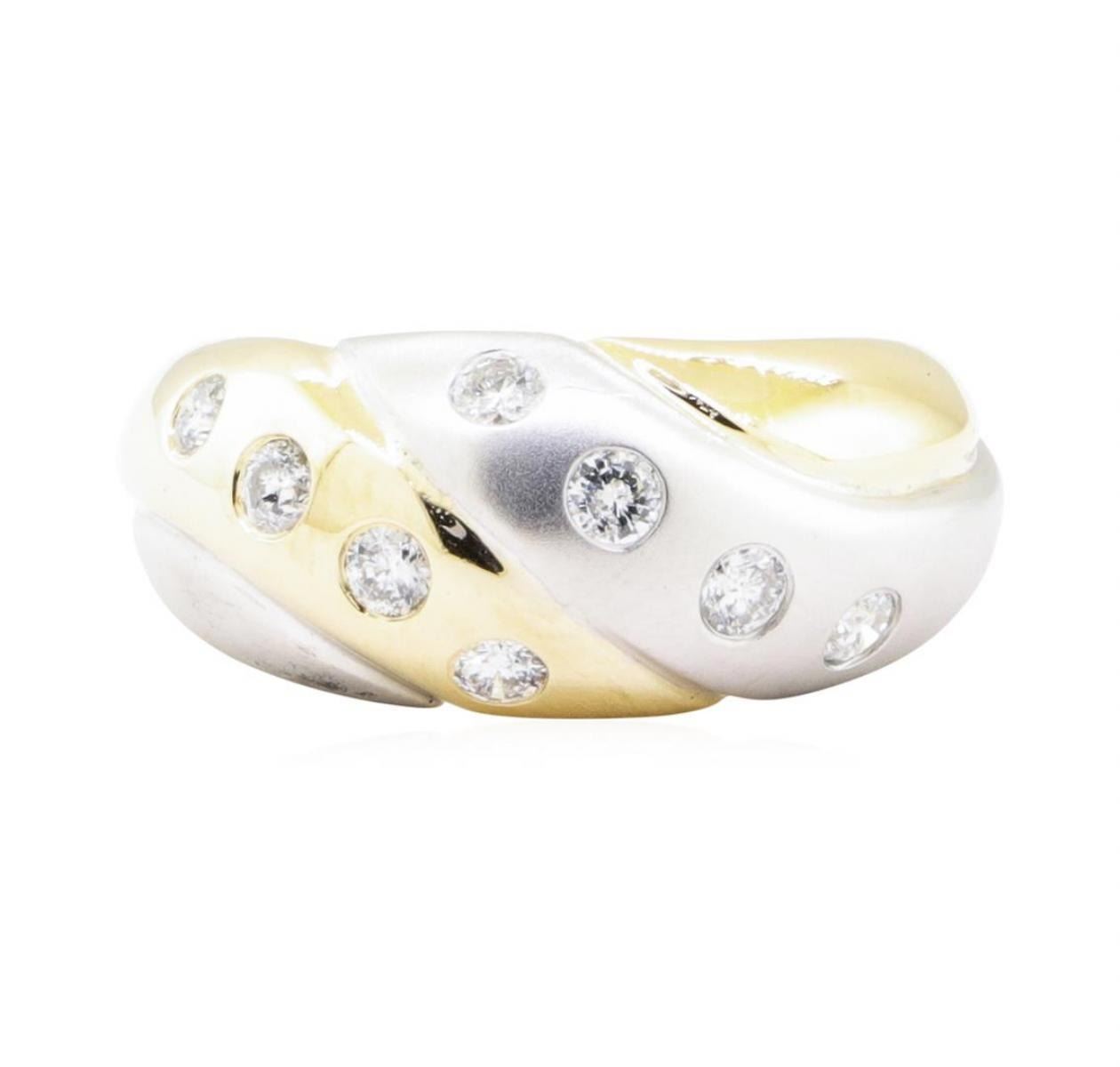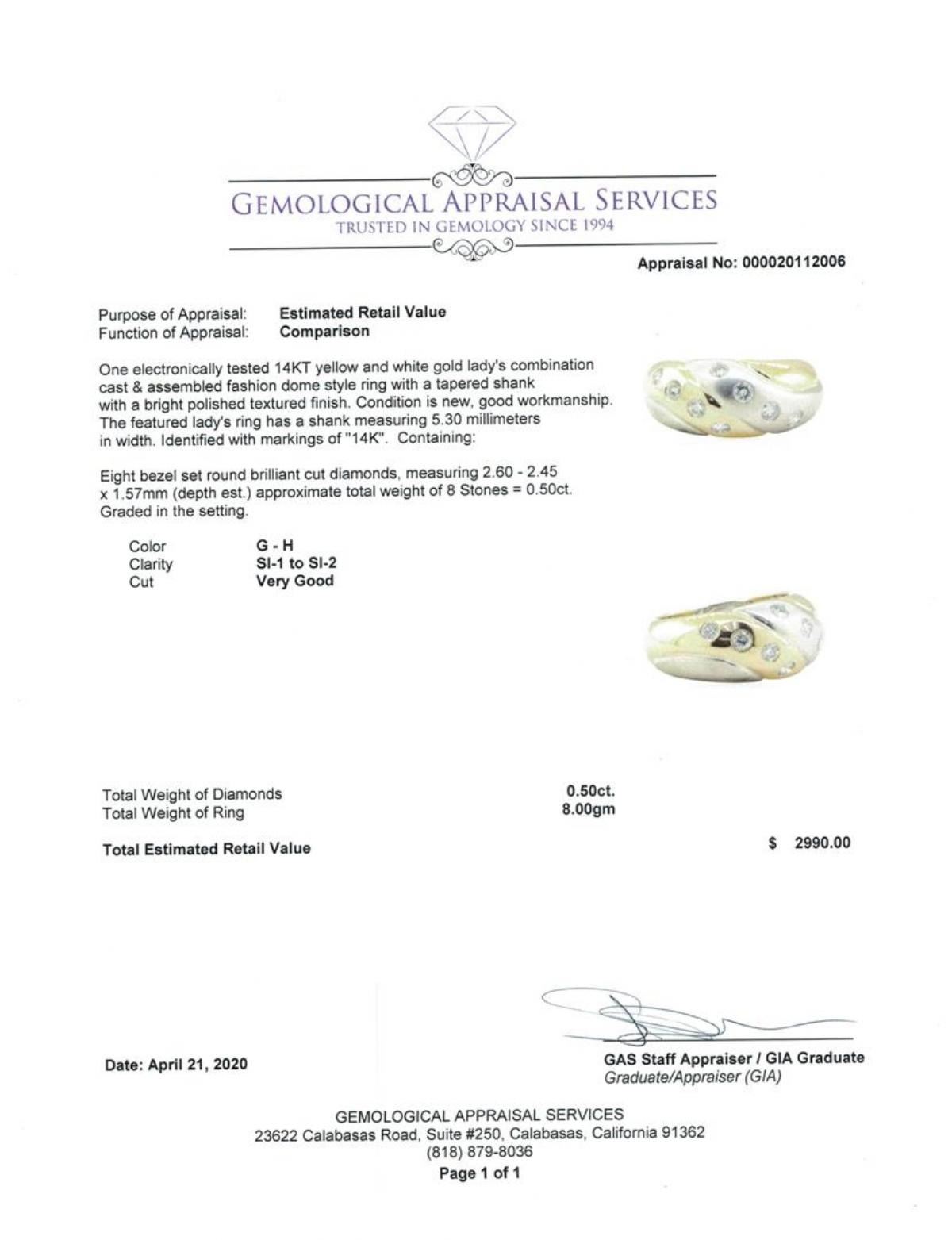 One electronically tested 14KT yellow and white gold lady's combination cast & assembled fashion dome style ring with a tapered shank with a bright polished textured finish. The featured lady's ring has a shank measuring 5.30 millimeters in width. Identified with markings of '14K'. Condition is new, good workmanship. Containing: Eight bezel set round brilliant cut diamonds, measuring 2.60 - 2.45 x 1.57mm (depth est.) approximate total weight of 8 Stones = 0.50 ct. Graded in the setting. Color G - H Clarity SI-1 to SI-2 Cut Very Good. Total Weight of Diamonds 0.50 ct.. Total Weight of Ring 8.00gm GAS Appraised at $2990.00. GAS Appraised.