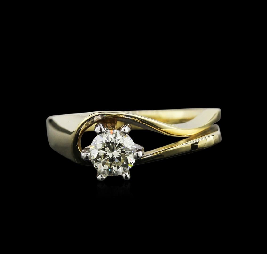 One electronically tested 14KT yellow gold ladies cast & assembled diamond solitaire ring with a bright polish finish. Condition is good. The featured diamond is set within a 14KT white gold basket supported by stylized shoulders, completed by a two millimeter wide band. Identified with markings of "14K". Containing: One prong set round brilliant cut diamond, measuring 5.10 - 5.00 x 3.03mm (depth est.) approximate weight of 0.50ct with a medium blue fluorescence. Graded in the setting. Clarity: VS-1. Color: J. Total Weight of Diamonds: 0.50ct. Total Weight of Ring: 5.78 gm. AIG Appraised at $6,365.00.