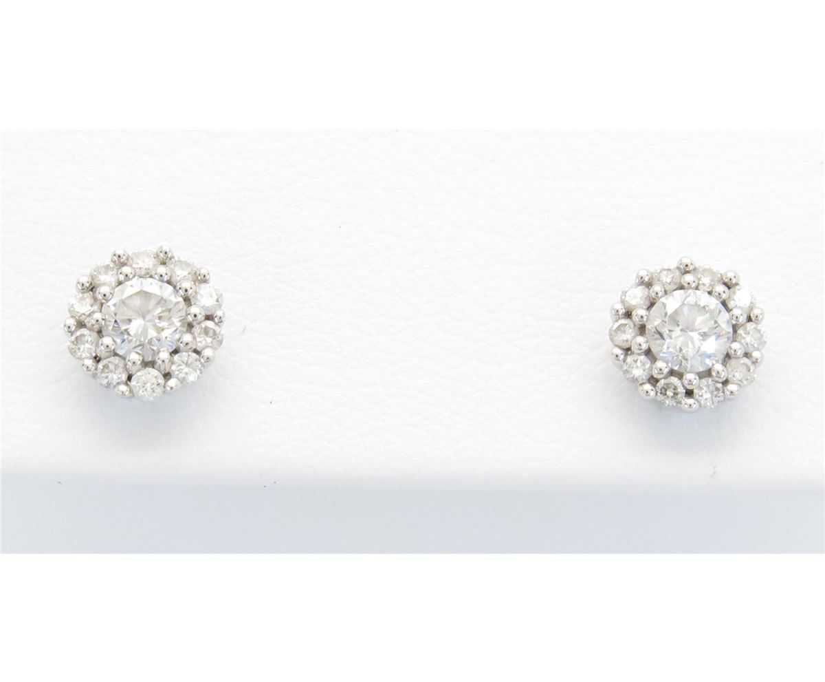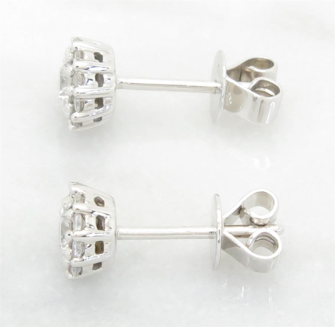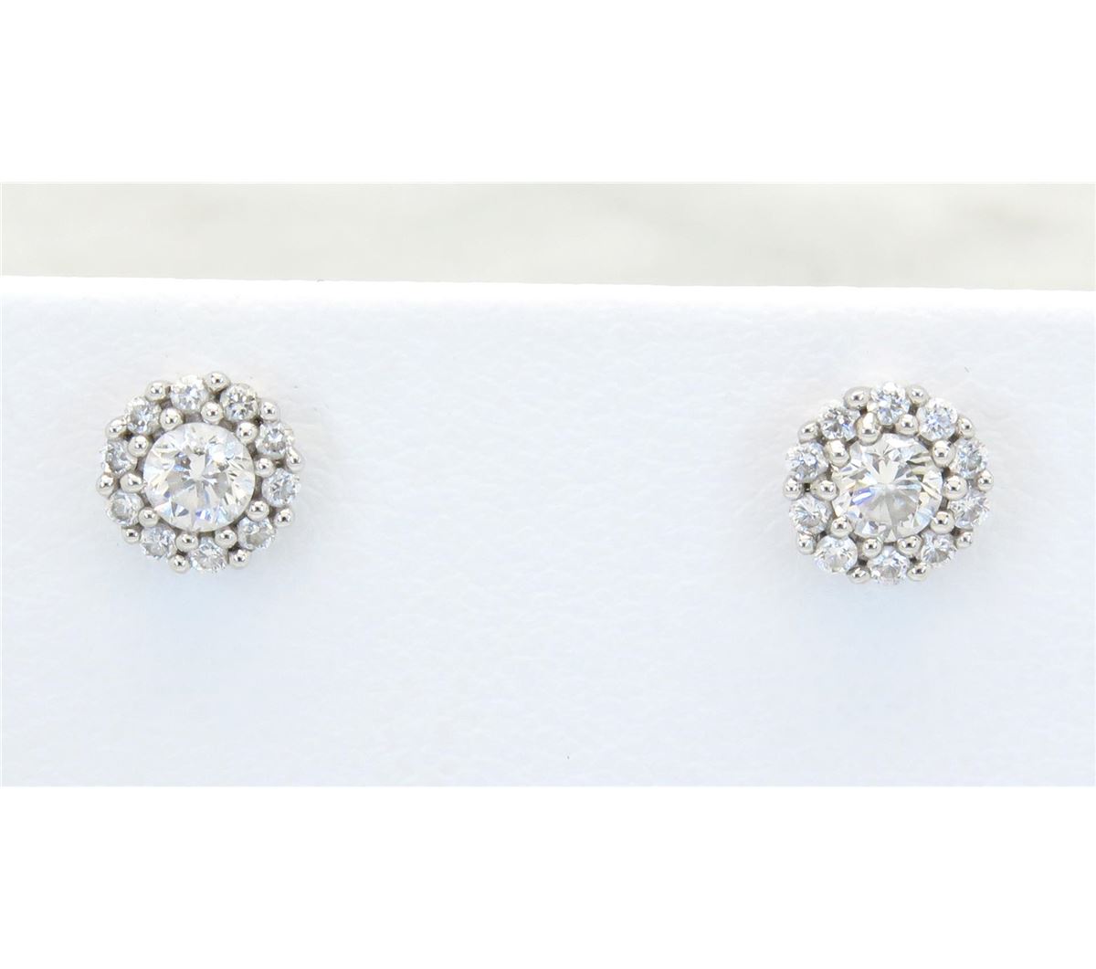 One tested pair of 14K white gold diamond earrings. Featuring: 22 Round Brilliant Cut Diamonds. Clarity: SI, Color: F-H. Approximate total diamond weight: .50CTW. All diamonds are graded in the mounting unless otherwise stated. Weight of earrings: 1.8 grams.