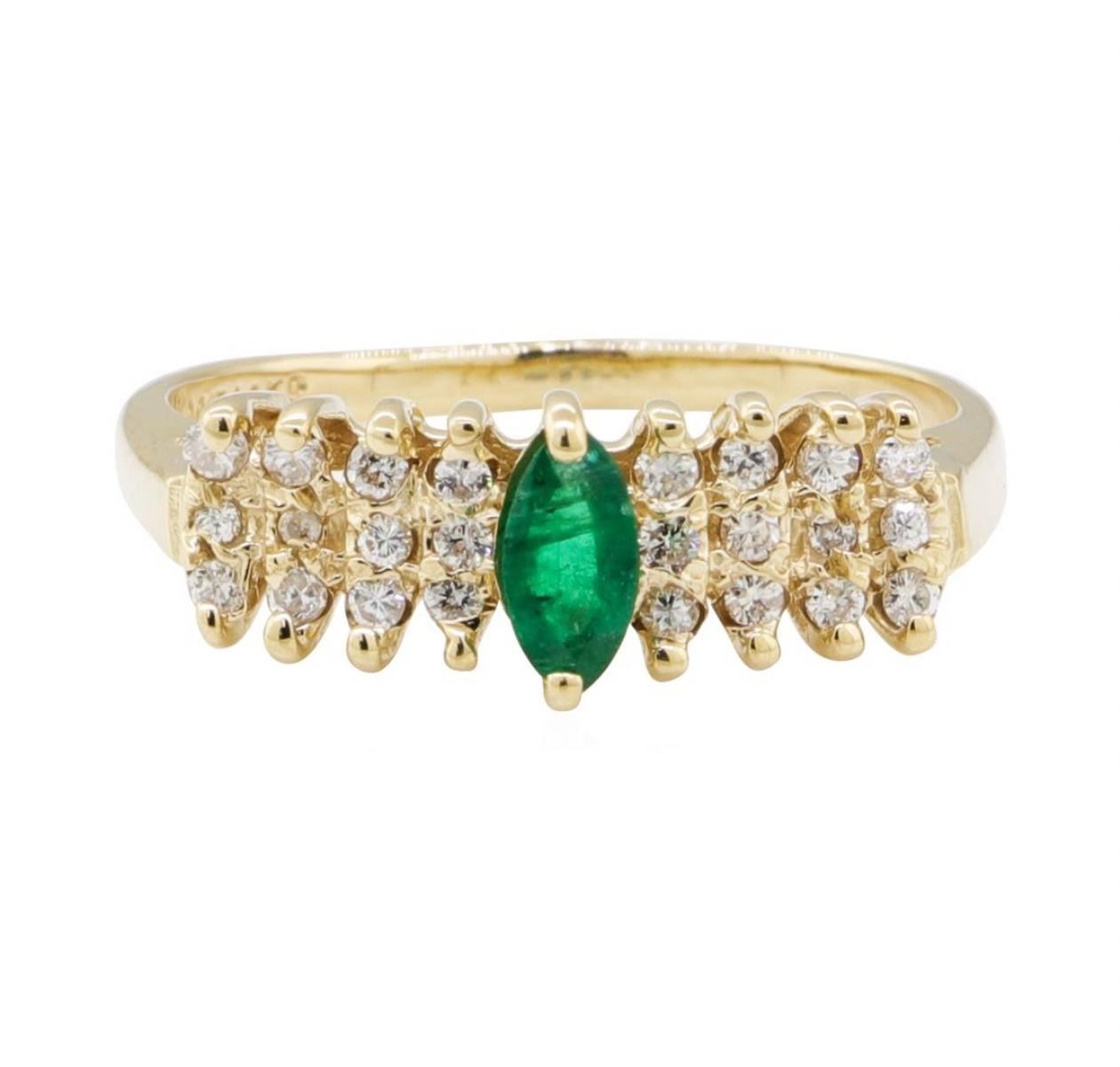 One ring featuring: 14KT yellow gold weighing 2.4 grams containing one emerald weighing .15ct and diamonds weighing 0.35ctw.