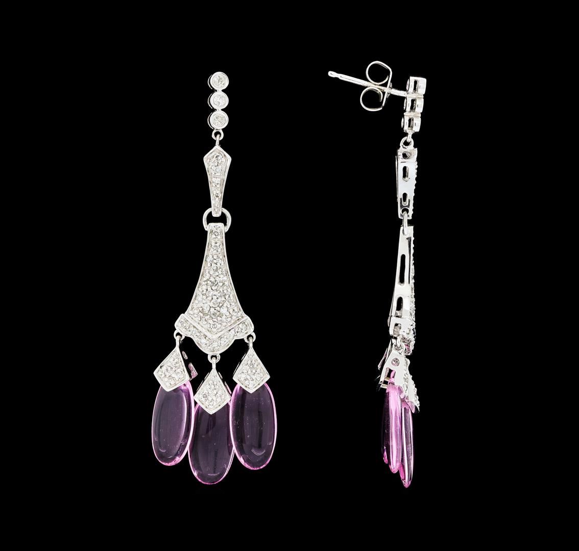 One pair of lady's earrings featuring: 14KT white gold weighing 8.1 grams containing diamonds weighing 0.50ctw and six dangling pieces of pink crystal.