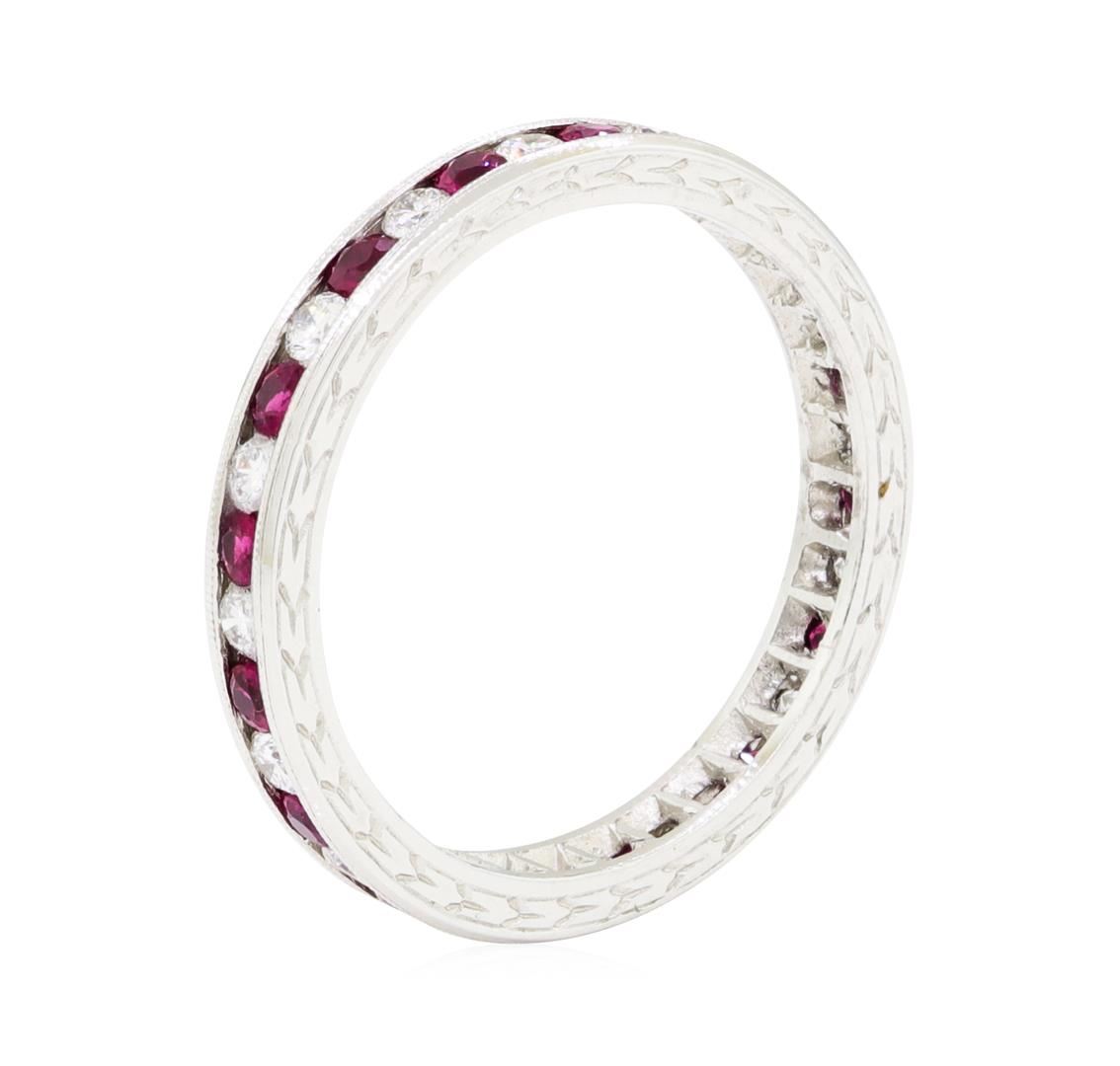 One lady's eternity ring featuring: 14KT white gold weighing 3.1 grams containing rubies weighing 0.50ctw and diamonds weighing 0.50ctw.