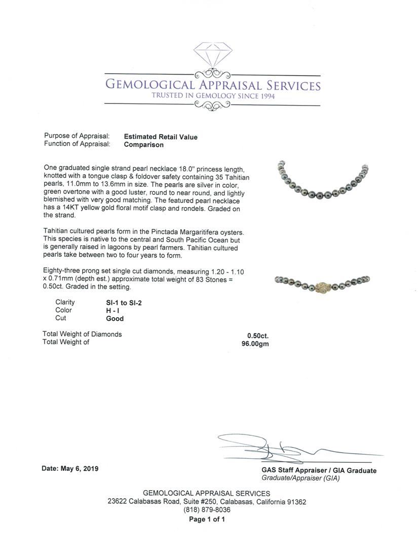 One graduated single strand pearl necklace 18.0' princess length, knotted with a tongue clasp & foldover safety containing 35 Tahitian pearls, 11.0mm to 13.6mm in size. The pearls are silver in color, green overtone with a good luster, round to near round, and lightly blemished with very good matching. The featured pearl necklace has a 14KT yellow gold floral motif clasp and rondels. Graded on the strand.Tahitian cultured pearls form in the Pinctada Margaritifera oysters. This species is native to the central and South Pacific Ocean but is generally raised in lagoons by pearl farmers. Tahitian cultured pearls take between two to four years to form. Eighty-Three prong set single cut diamonds, measuring 1.20 - 1.10 x 0.71mm (depth est.) approximate total weight of 83 Stones = 0.50ct. Graded in the setting. Color H - I Clarity SI-1 to SI-2 Cut Good. Total Weight of Diamonds 0.50ct.. Total Weight of 96.00gm GAS Appraised at $16085.00. GAS Appraised at $16,085.00.