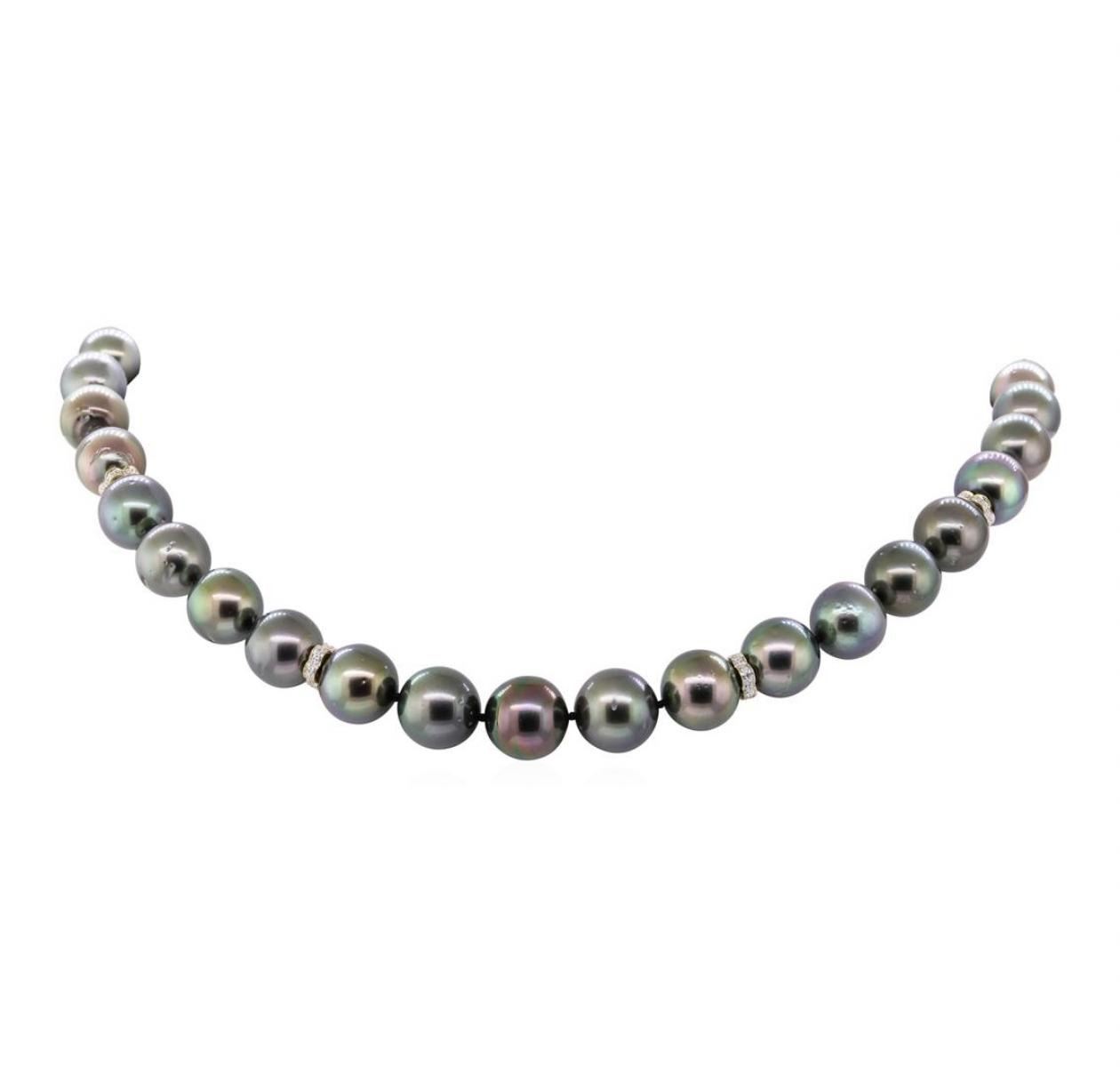 One graduated single strand pearl necklace 18.0' princess length, knotted with a tongue clasp & foldover safety containing 35 Tahitian pearls, 11.0mm to 13.6mm in size. The pearls are silver in color, green overtone with a good luster, round to near round, and lightly blemished with very good matching. The featured pearl necklace has a 14KT yellow gold floral motif clasp and rondels. Graded on the strand.Tahitian cultured pearls form in the Pinctada Margaritifera oysters. This species is native to the central and South Pacific Ocean but is generally raised in lagoons by pearl farmers. Tahitian cultured pearls take between two to four years to form. Eighty-Three prong set single cut diamonds, measuring 1.20 - 1.10 x 0.71mm (depth est.) approximate total weight of 83 Stones = 0.50ct. Graded in the setting. Color H - I Clarity SI-1 to SI-2 Cut Good. Total Weight of Diamonds 0.50ct.. Total Weight of 96.00gm GAS Appraised at $16085.00. GAS Appraised at $16,085.00.