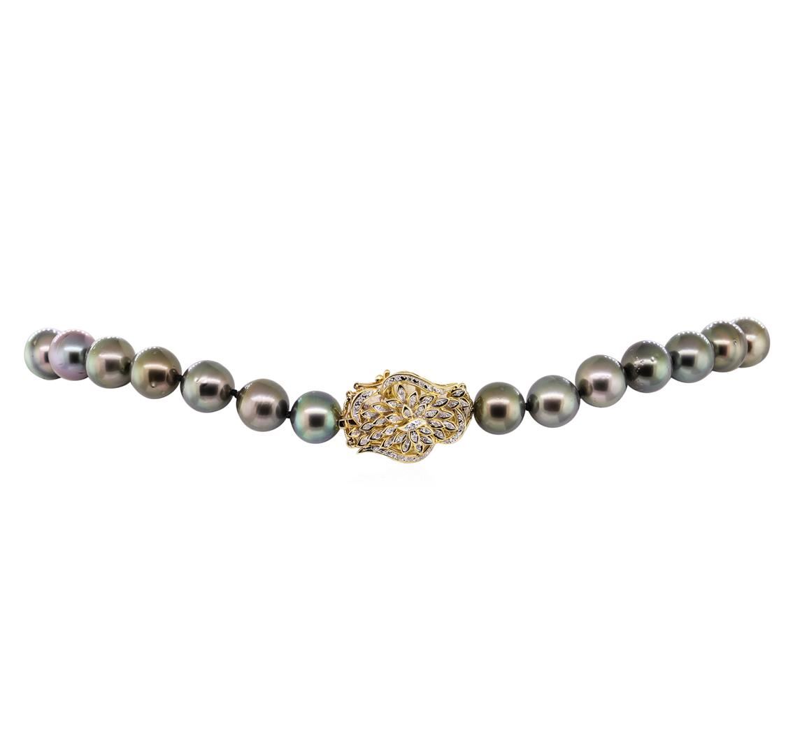 One graduated single strand pearl necklace 18.0' princess length, knotted with a tongue clasp & foldover safety containing 35 Tahitian pearls, 11.0mm to 13.6mm in size. The pearls are silver in color, green overtone with a good luster, round to near round, and lightly blemished with very good matching. The featured pearl necklace has a 14KT yellow gold floral motif clasp and rondels. Graded on the strand.Tahitian cultured pearls form in the Pinctada Margaritifera oysters. This species is native to the central and South Pacific Ocean but is generally raised in lagoons by pearl farmers. Tahitian cultured pearls take between two to four years to form. Eighty-Three prong set single cut diamonds, measuring 1.20 - 1.10 x 0.71mm (depth est.) approximate total weight of 83 Stones = 0.50ct. Graded in the setting. Color H - I Clarity SI-1 to SI-2 Cut Good. Total Weight of Diamonds 0.50ct.. Total Weight of 96.00gm GAS Appraised at $16085.00. GAS Appraised.