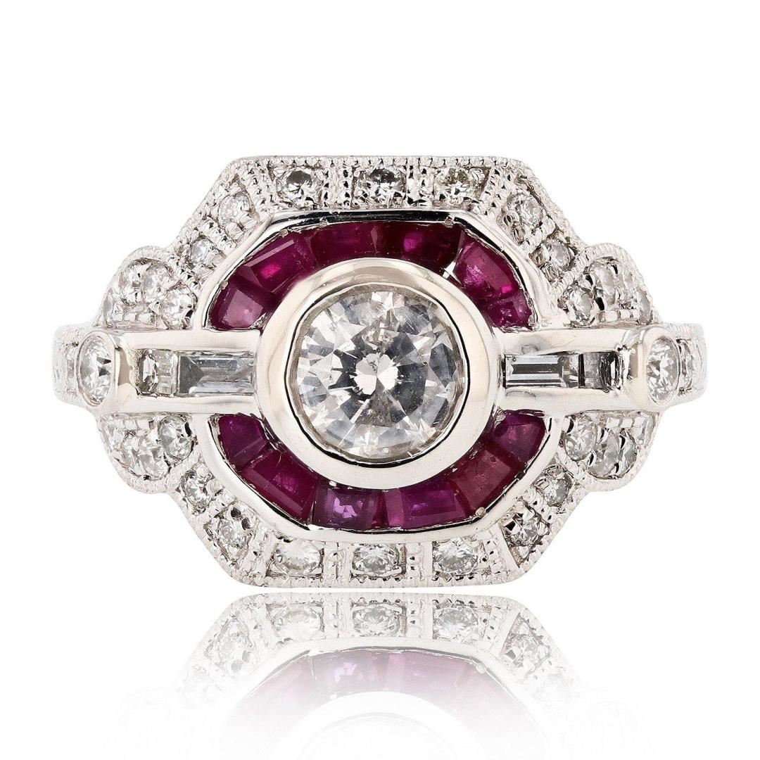 Platinum Diamond & Ruby Ring One polished, stamped, and tested platinum ring with a bright finish. The ring is mounted with 1 genuine diamond center stone weighing approximately 0.50 carat, 12 genuine faceted rubies weighing approximately 1.06 carats, and 40 genuine faceted diamonds weighing approximately 0.58 carats. This item weighs 9.9 grams, condition is new, excellent workmanship. MAIN GEMSTONE Identity: Natural Diamond Shape: Round Cutting Style: Brilliant Cut Average Diameter: 5.2 mm Weight: 0.50 carat Color Grade: F Cut Grade: I1 Polish: Excellent Symmetry: Very Good Refractive Index: 2.417 Hardness: 10 ADJACENT GEMSTONES ON RING Identity: Natural Diamond Cut: Baguette / Round Brilliant Quantity: 40 Diamonds Measurements: 2.0 - 3.0 mm (4 baguette) 1.1 - 2.0 mm (36 round) Total Weight: 0.58 carats Color Grade: G - I Clarity Grade: SI1 to SI2 Refractive Index: 2.418 Hardness: 10 ADJACENT GEMSTONES ON RING Species: Natural Corundum Variety: Ruby Shape: Trapezoid / Baguette Cutting Style: Step Cut Quantity: 12 Rubies Total Weight: 1.06 carats Color: Red Cut Grade: Good - Very Good Refractive Index: 1.762 - 1.770 DR Birefringence: 0.008 - 0.010 Hardness: 9 CENTER DIAMOND WEIGHT: 0.50ct TOTAL RUBY WEIGHT: 1.06ctw TOTAL DIAMOND WEIGHT: 1.08ctw WEIGHT OF ITEM: 9.9 grams METAL: Platinum Size: 6 1/4