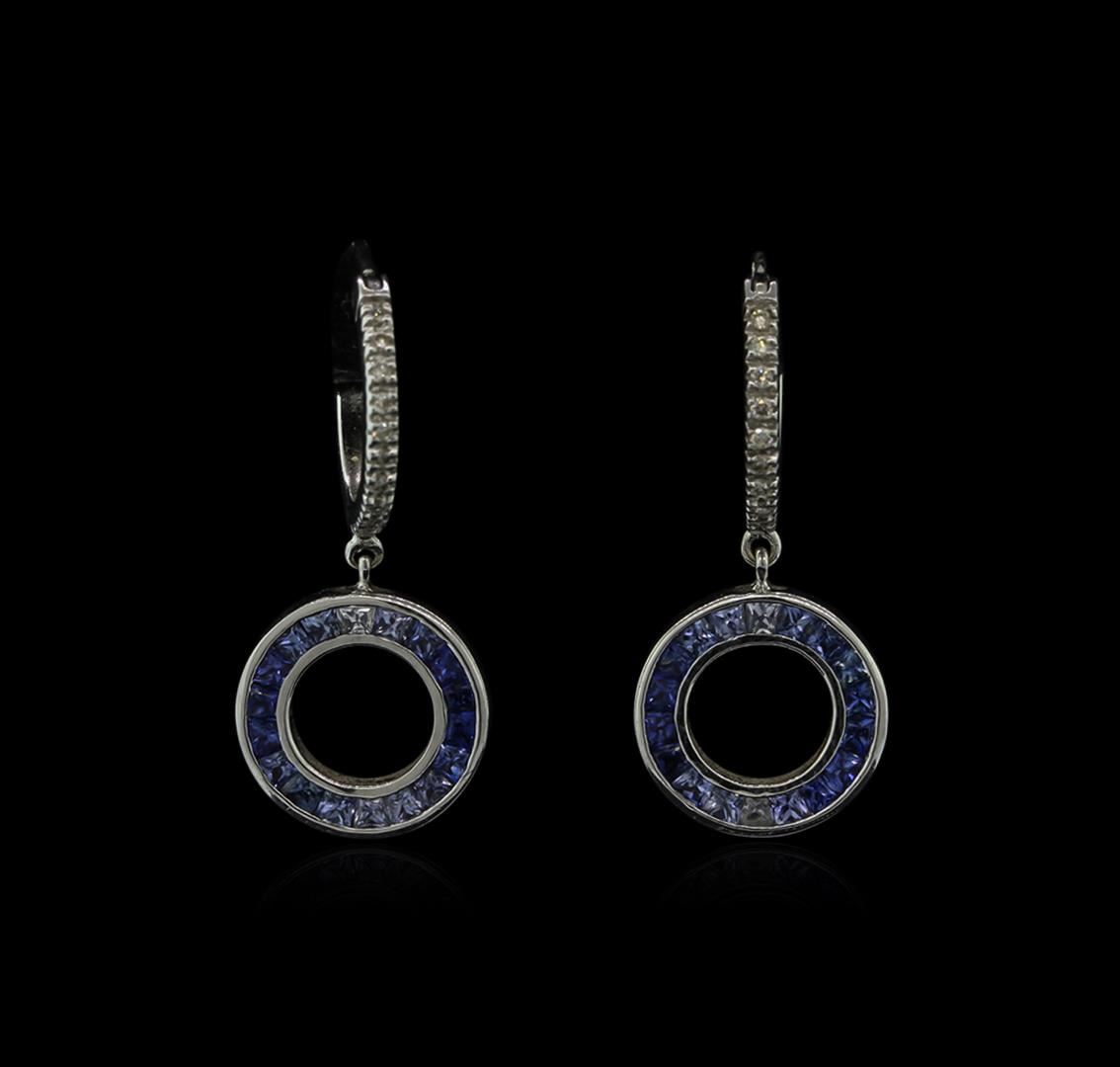 One pair of dangle earrings featuring: 14KT white gold weighing 5.20 grams containing channel set princess cut multi-sapphires with a total weight of 0.50ct and prong set round diamonds with a total weight of 0.10ct.