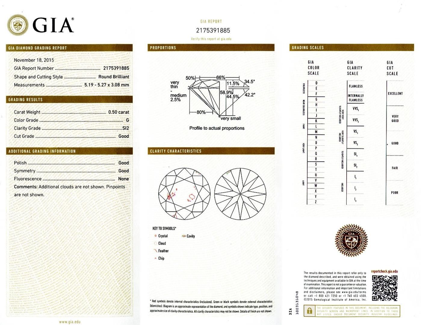 One electronically tested 18KT white gold ladies cast diamond unity ring with a bright polish finish. Condition is new, good workmanship. The featured diamond is accented by a single diamond on either side supported by diamond set shoulders, completed by a one and one-half millimeter wide band. Trademark is Orianne. Identified with markings of "18K". Containing: One prong set round brilliant cut diamond, measuring 5.19 - 5.27 x 3.08mm exact weight 0.50ct. GIA Diamond Grading Report attached. Graded loose prior to setting in the GIA Laboratory, Report #2175391885. Clarity: SI2 Color: G Depth: 58.9% Table: 66.0% Pavil. Depth%: 44.5% Crown Angle: 34.5 Degrees Polish: Good Symmetry: Good Fifty-eight prong set round brilliant cut diamonds approximate total weight of 58 Stones = 0.88ctw. Graded in the setting. Clarity: SI2 to I1 Color: G - I Total Weight of Diamonds 1.38ctw. Total Weight of Ring 2.33 gm #Size: 6 1/2
