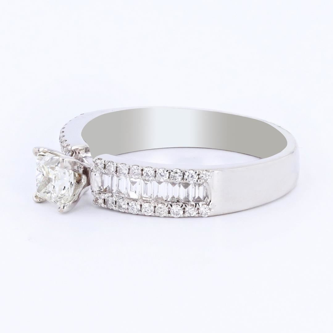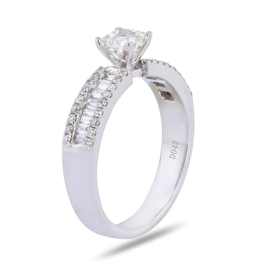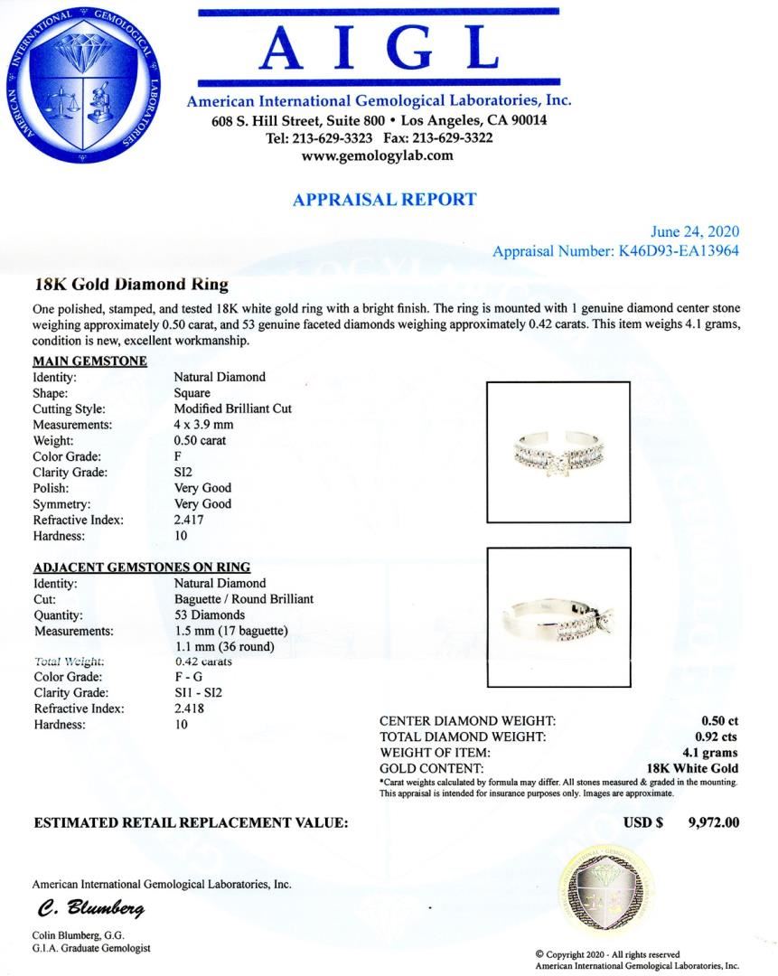 One polished, stamped, and tested 18K white gold ring with a bright finish. The ring is mounted with 1 genuine diamond center stone weighing approximately 0.50 carat, and 53 genuine faceted diamonds weighing approximately 0.42 carats. This item weighs 4.1 grams, condition is new, excellent workmanship. MAIN GEMSTONE Identity: Natural Diamond Shape: Square Cutting Style: Modified Brilliant Cut Measurements: 4 x 3.9mm Weight: 0.50 carat Color Grade: F Clarity Grade: SI2 Polish: Very Good Symmetry: Very Good Refractive Index: 2.417 Hardness: 10 ADJACENT GEMSTONES ON RING Identity: Natural Diamond Cut: Baguette / Round Brilliant Quantity: 53 Diamonds Measurements: 1.5mm (17 baguette) 1.1mm (36 round) Total Weight: 0.42 carats Color Grade: F - G Clarity Grade: SI1 to SI2 Refractive Index: 2.418 Hardness: 10 CENTER DIAMOND WEIGHT: 0.50ct TOTAL DIAMOND WEIGHT: 0.92ctw WEIGHT OF ITEM: 4.1 grams GOLD CONTENT: 18K White Gold Size: 6 1/2