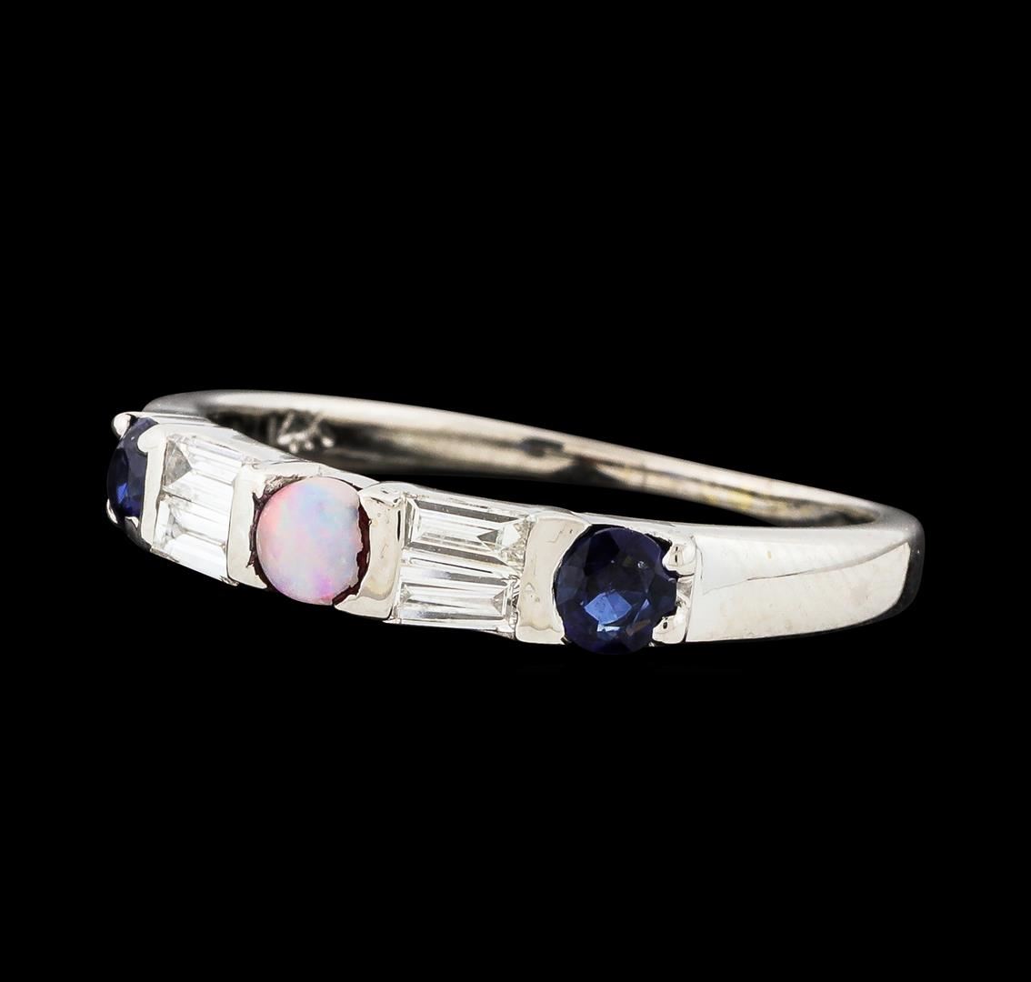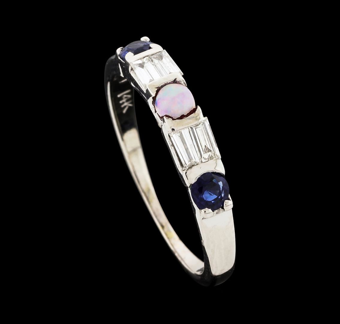 One ring: 14KT white gold weighing 2.40 grams containing one sapphire weighing 0.50ct, one opal weighing 0.25ct, and diamonds weighing 0.30ctw.