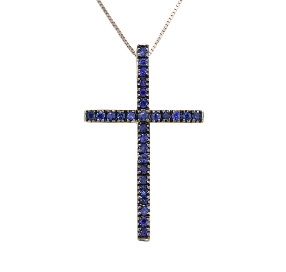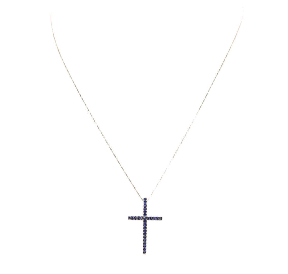 One pendant with a eighteen inch long 0.6mm box link chain featuring: 14KT white gold weighing 3.0 grams containing sapphires weighing 0.50ctw.