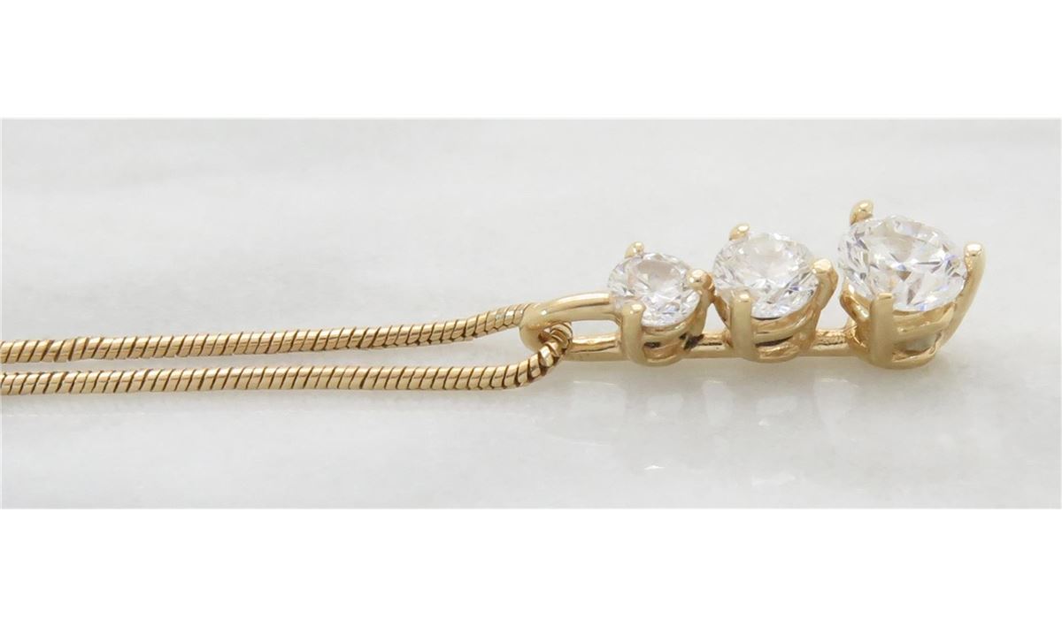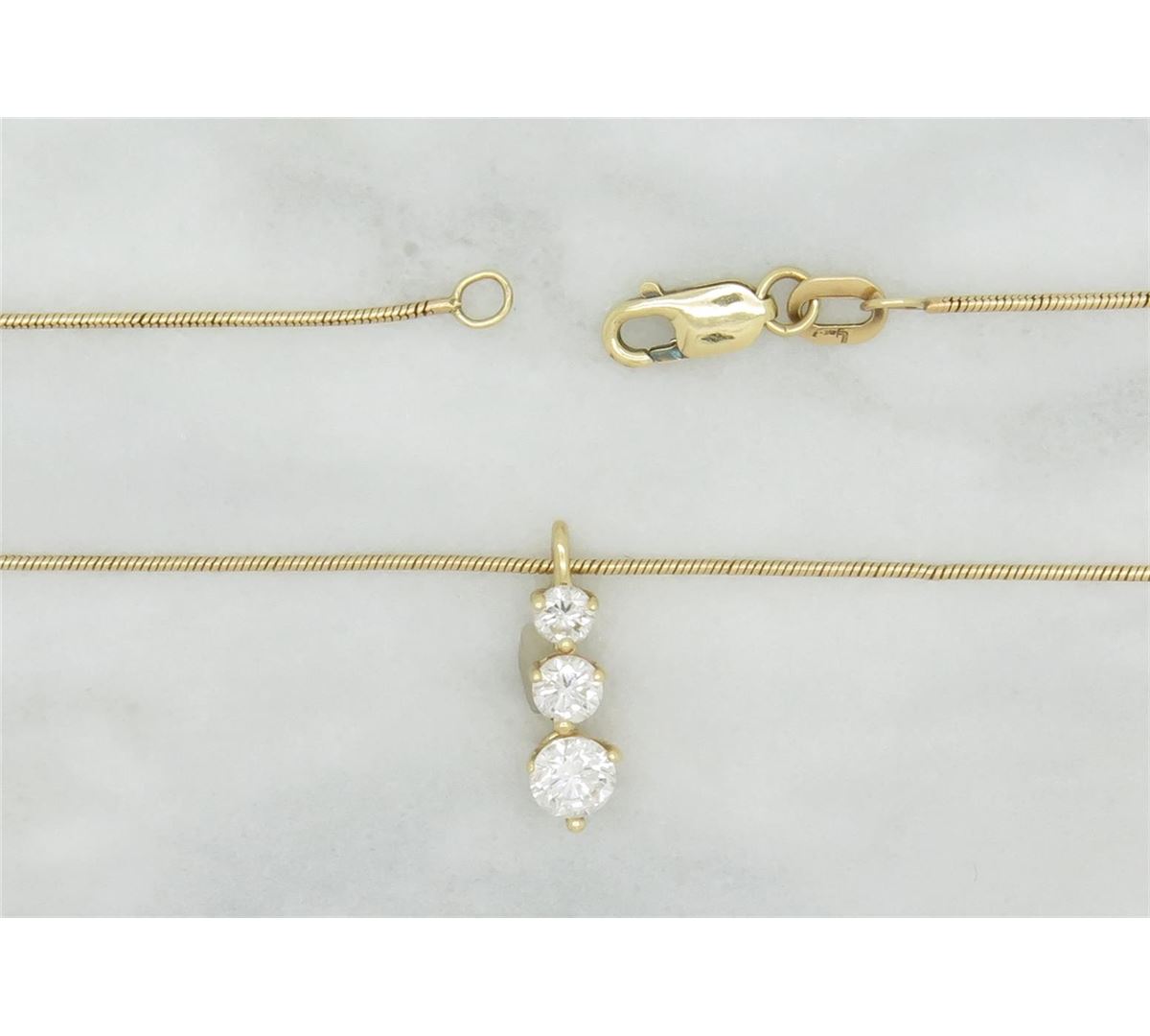 One tested 14K yellow gold diamond pendant. Containing: Three Round Brilliant Cut Diamonds. Approximate total diamond weight: 1/2CTW. Diamonds are graded in the mounting, unless otherwise stated. Weight: 3.5 grams. Size of chain: 22" long.