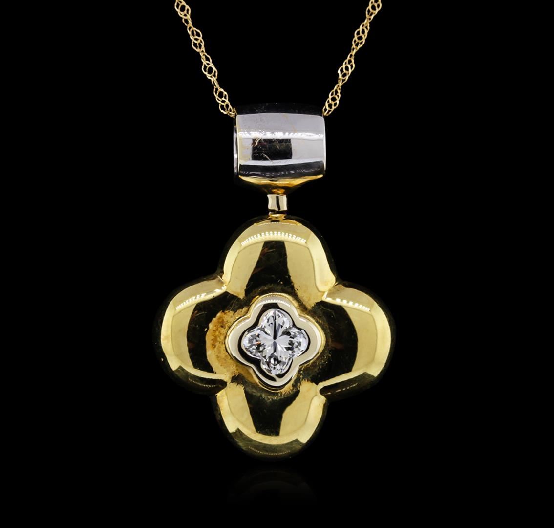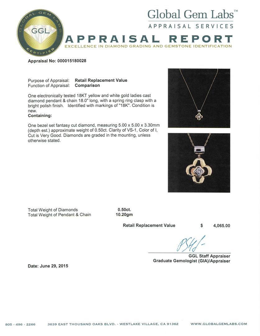 One electronically tested 18KT yellow and white gold ladies cast diamond pendant & chain 18.0" long, with a spring ring clasp with a bright polish finish. Identified with markings of "18K". Condition is new. Containing: One bezel set fantasy cut diamond, measuring 5.00 x 5.00 x 3.30mm (depth est.) approximate weight of 0.50ct. Clarity: VS-1. Color: I, Cut is Very Good. Diamonds are graded in the mounting, unless otherwise stated. Total Weight of Diamonds 0.50ct. Total Weight of Pendant & Chain 10.20 grams. GGL Appraised at $4,065.00.