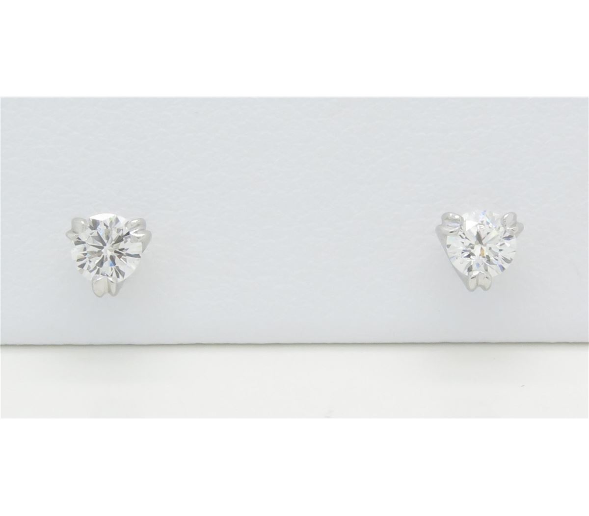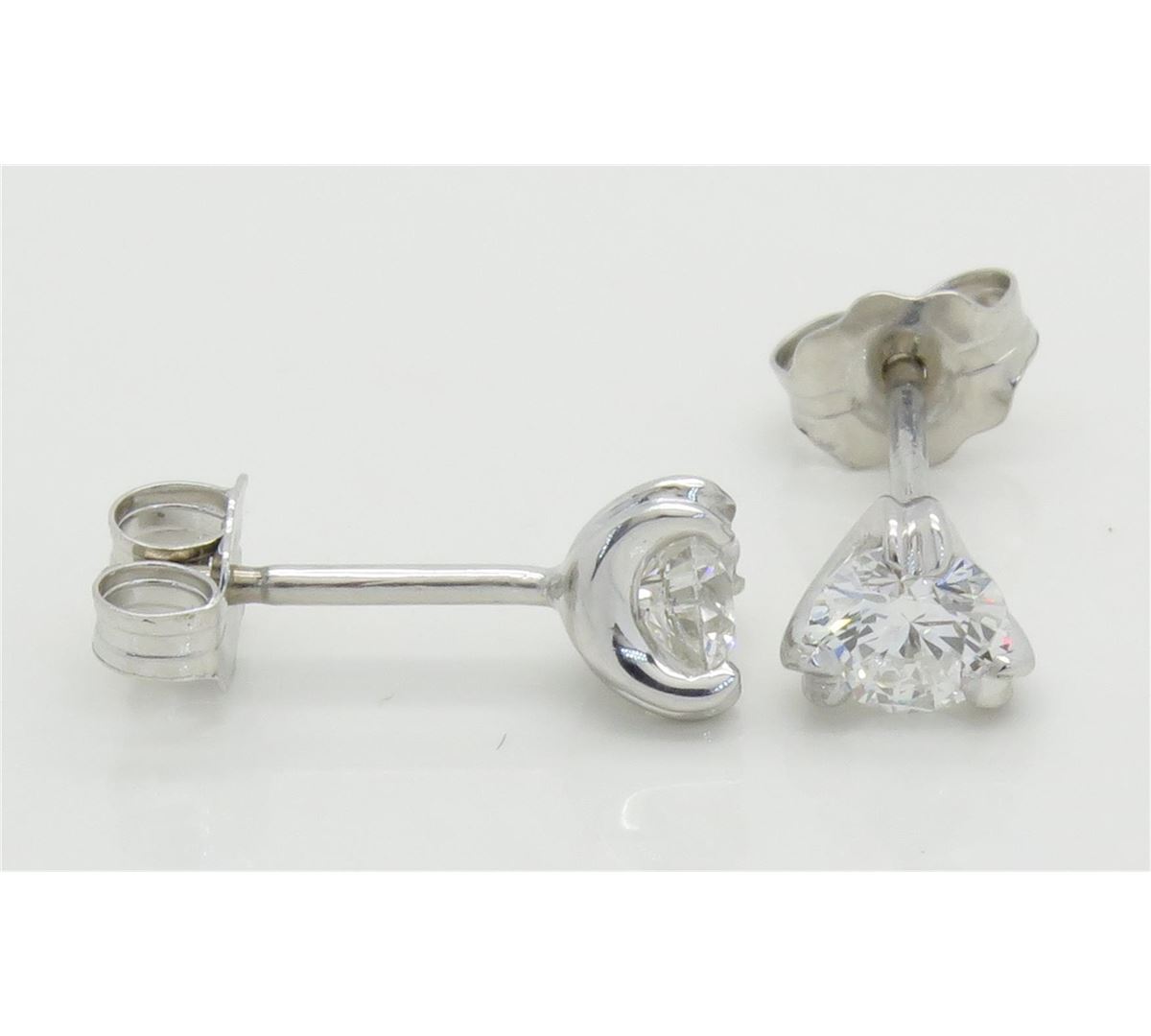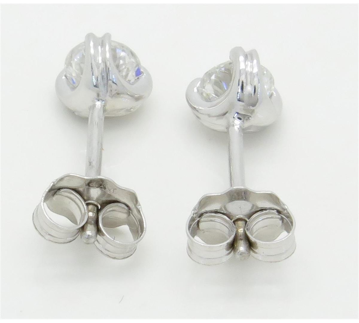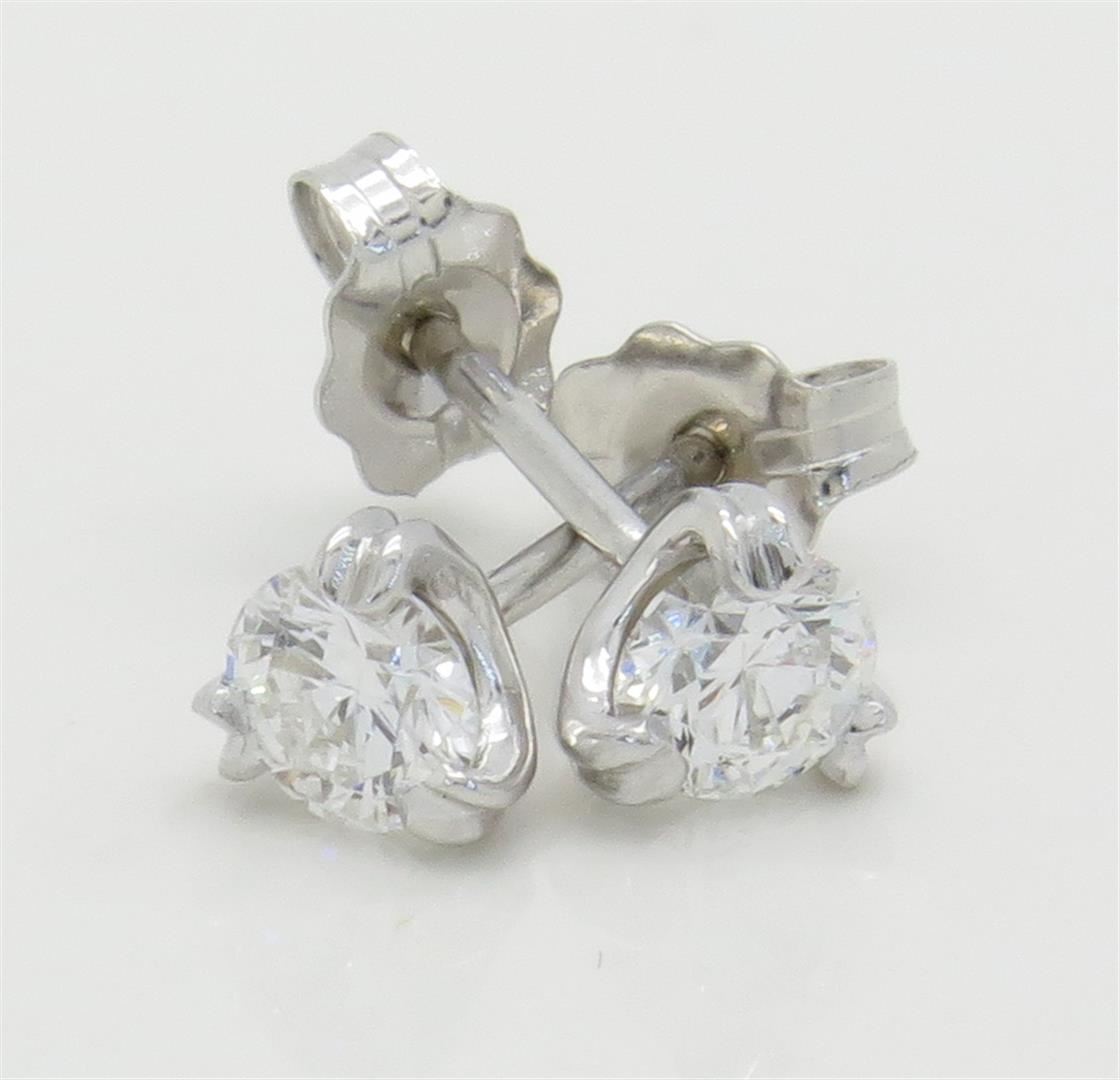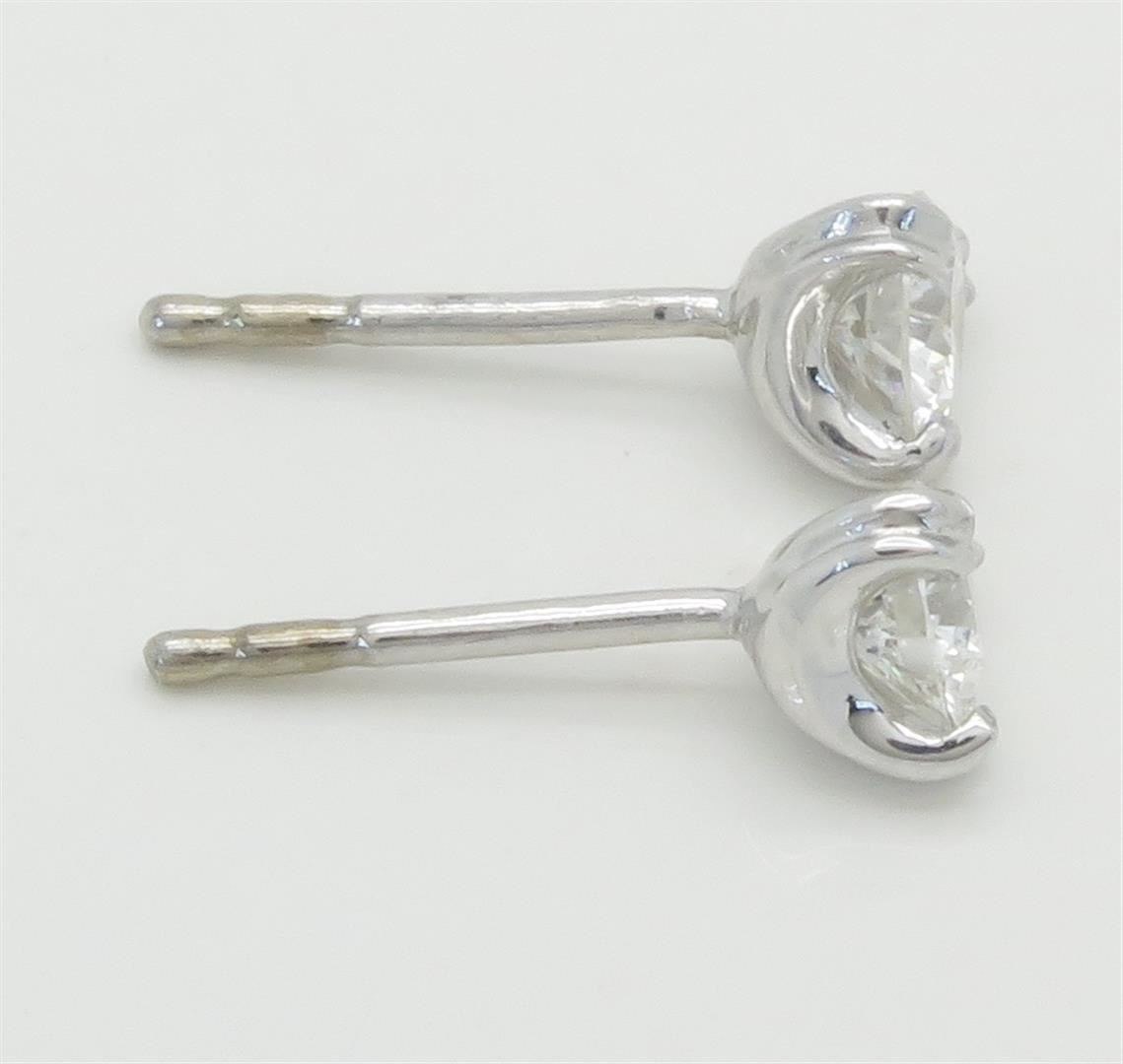 Two tested 14K white gold diamond earrings. Containing: Two Round Brilliant Cut Diamonds. Clarity: SI, Color: F-G. Approximate total diamond weight: .50CTW. Diamonds are graded in the mounting, unless otherwise stated. Weight of earrings: 1.0 gram.